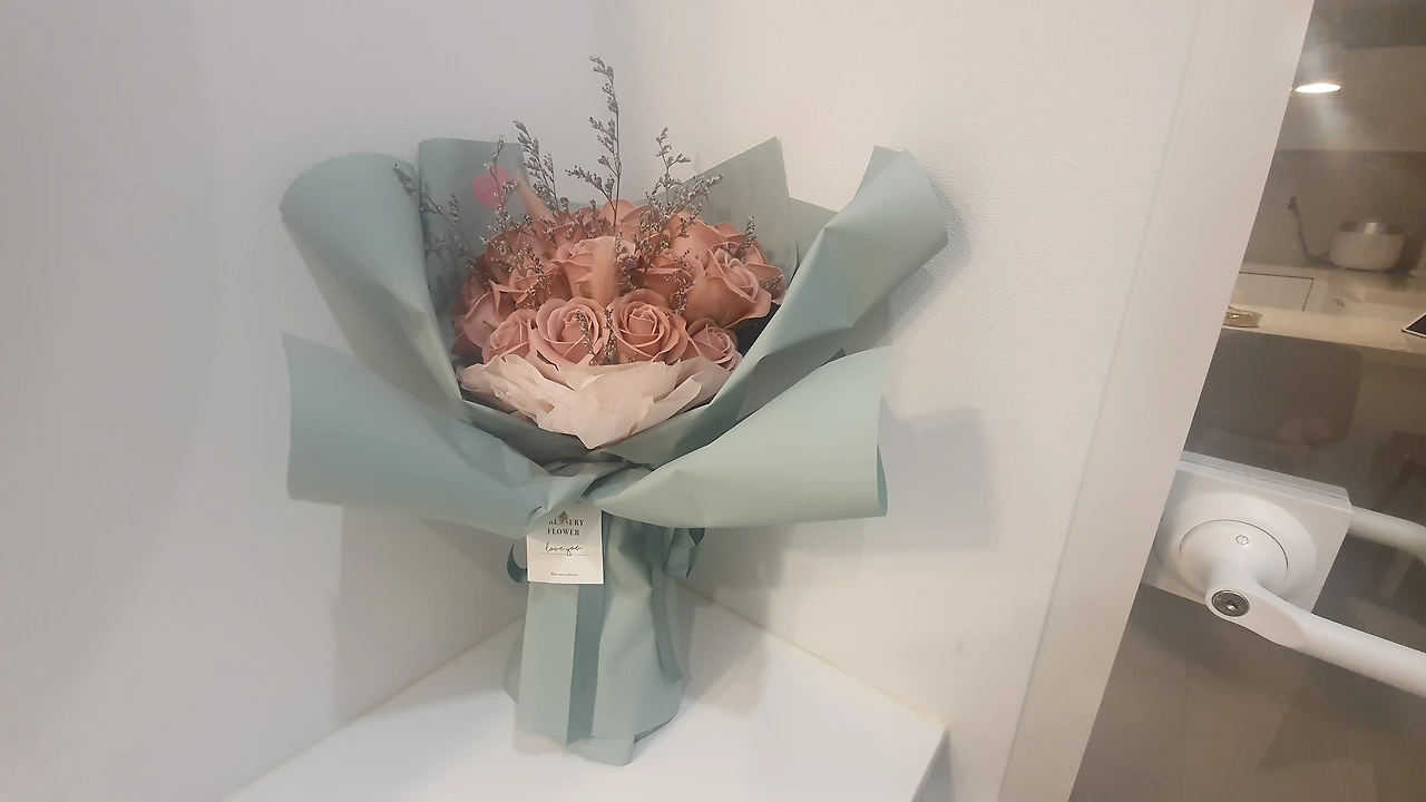 "이것 봐. 꽃이 있으니 분위기 살잖아. 양재에는 더 많은 꽃이 있다니. 가보자. 응응?"