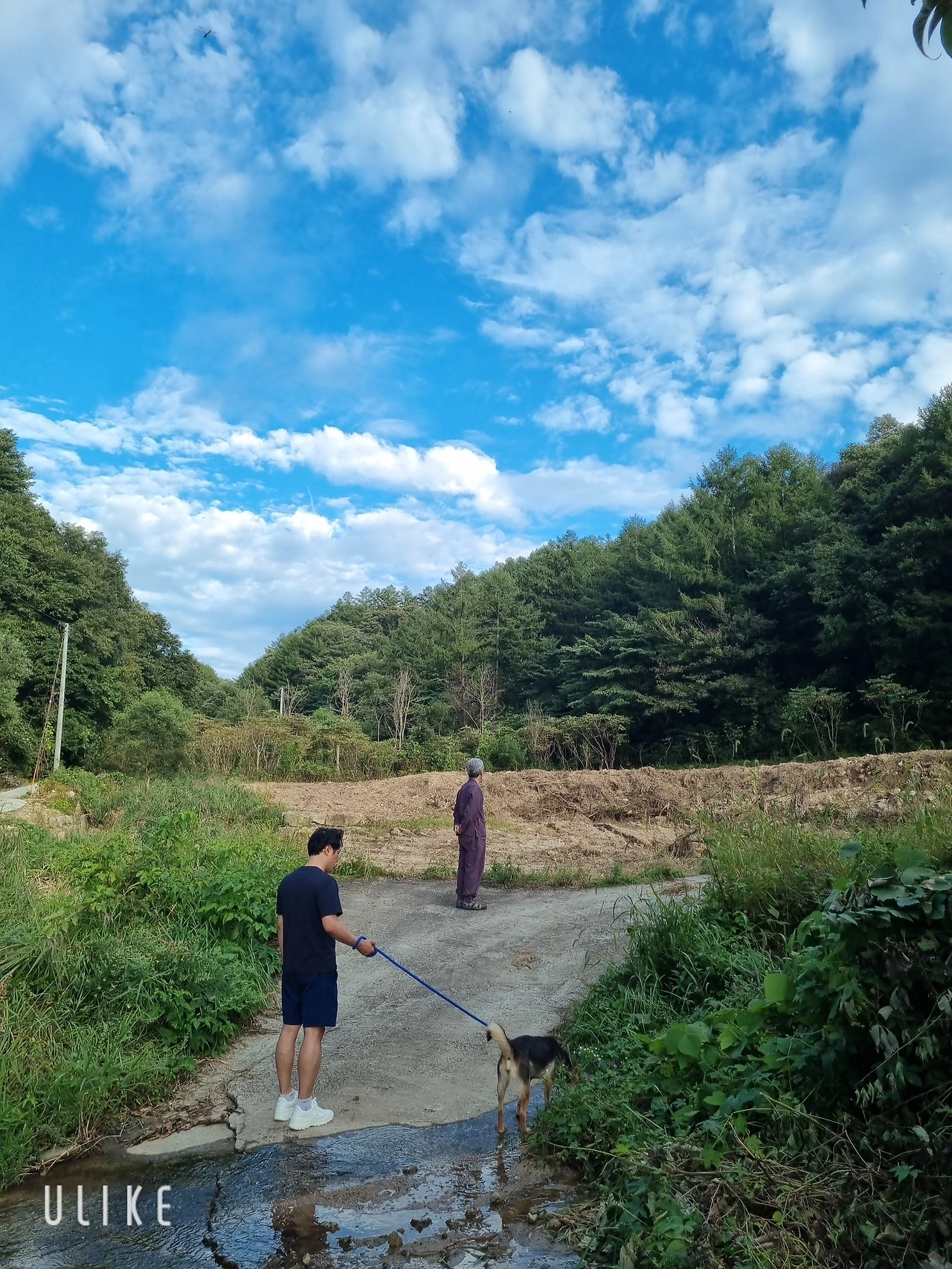 어느새 집에 돌아왔다. 또순이의 목줄을 갈아 끼우고, 마당 앞 넓적 바위에 앉아 쉬었다. 그리 길지 않은 길이라지만 오르막과 내리막이 연달아 있어 수월치 않았다. 딸은 또순이에게 간식을 주며 계속 장난을 걸었다. 이마에는 굵은 땀방울이 흘러내렸다. 낮의 평온한 바람이 밤의 차가운 산바람이 되었다. 얼추 땀이 식을 무렵 천천히 자리에서 일어났다. 문 밖으로 구수한 음식 냄새가 퍼졌다.
