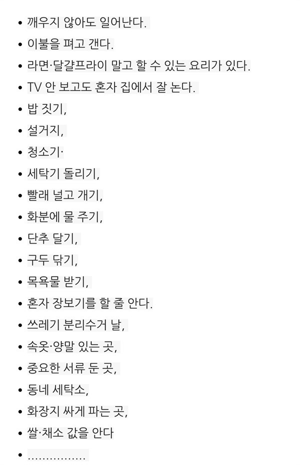 이어진 내용을 구체적으로 살펴보니 지금부터라도 가사에 적극적으로 참여해서 일상생활 수행 능력을 높여야 했다. 단순히 아내의 가사를 돕는다는 개념을 넘어 '남자의 가사'가 있어야 한다는 말이 무척 공감 되었다. 청소, 빨래, 요리는 기본이요, 가정 경제에 관해서도 알아야 할 것들이 많았다.