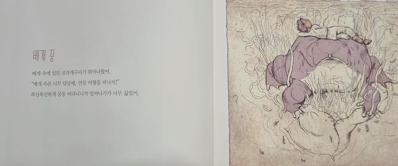 딸 : 아기 꿈이다. 납작한 피파개구리 등 위에서 아기 개구리가 나오는 장면이 징그러우면서도 신기했다. 아까 아빠가 피파개구리를 검색했을 때 진짜 등 위에 알 주머니를 만들고 그 안에서 새끼들이 태어나는 것이 사실이어서 놀랐다. 작가가 그 장면을 포착해서 글과 그림으로 표현하다니 대단하다는 생각이 들었다.
