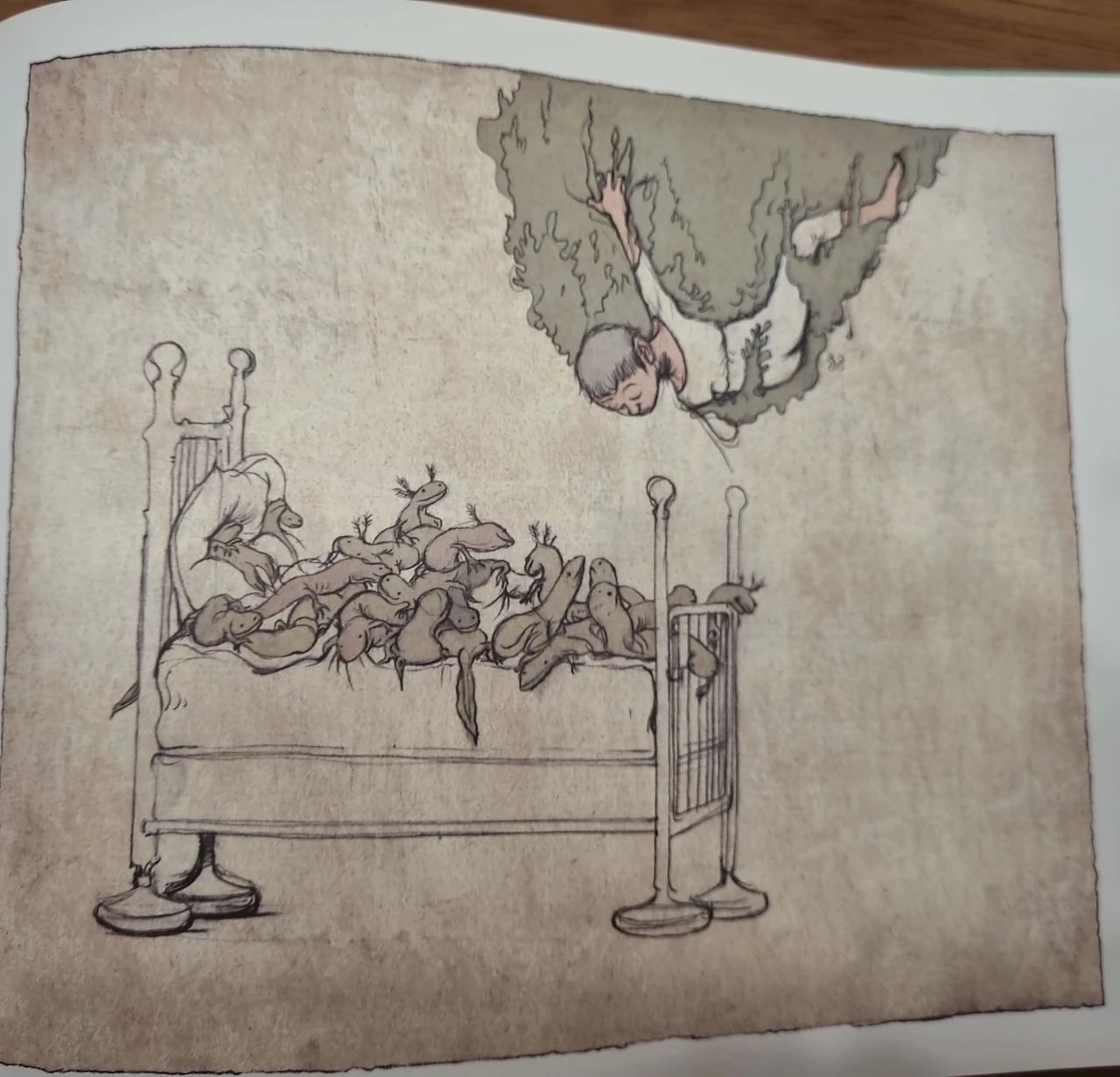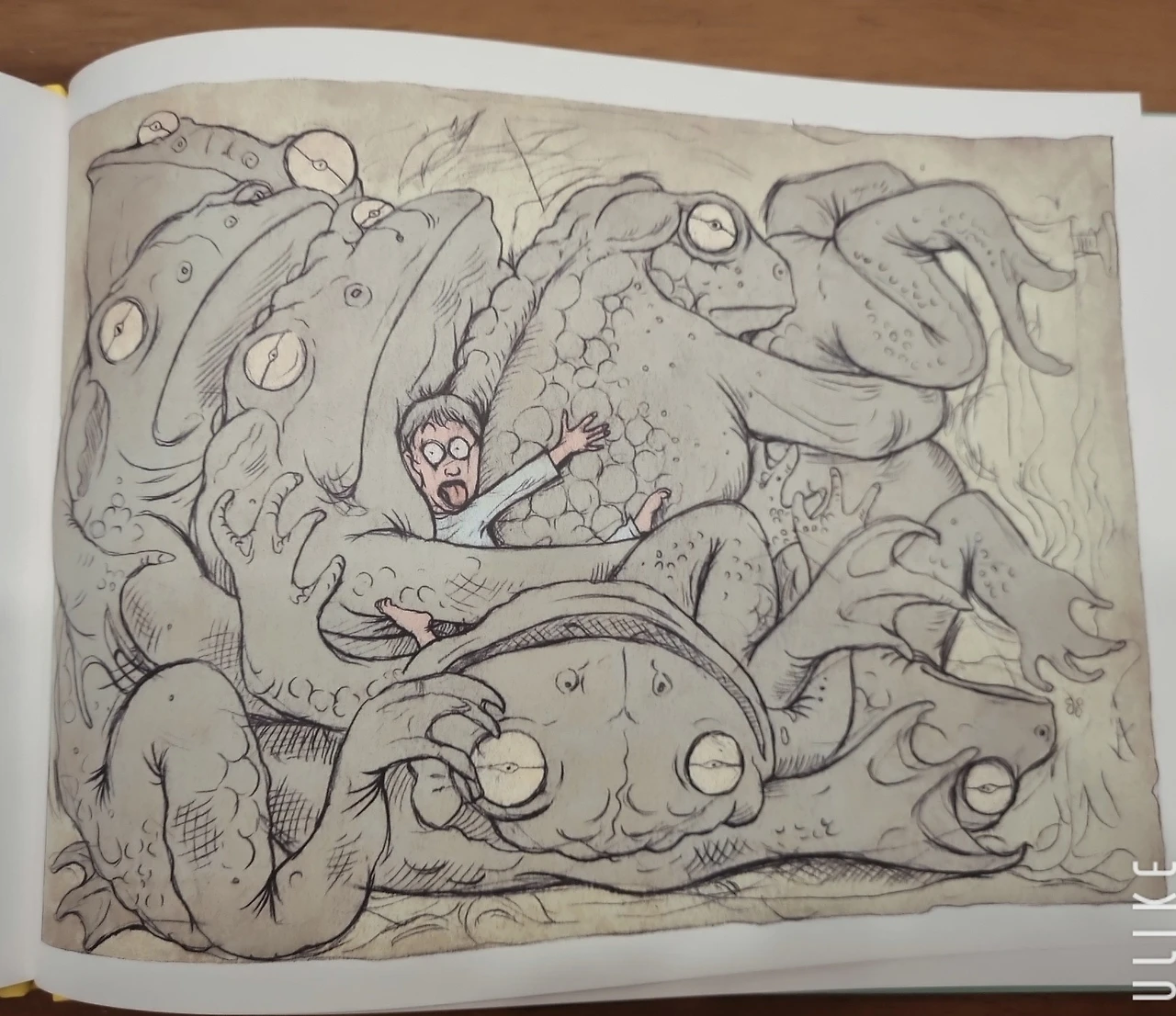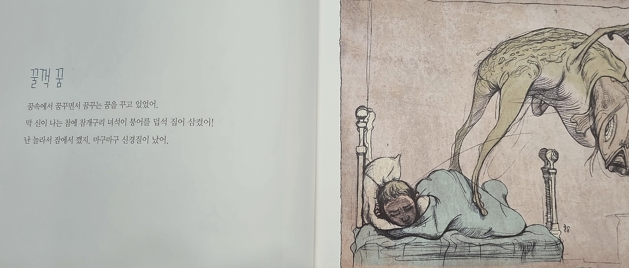아들 : 나는 엉망진창 꿈이다. 무엇보다도 작가가 어떤 의도로 이 내용을 썼는지 궁금했다. 통상 그림책에는 분명 숨겨진 의미가 있는데, 이 꿈에 관한 이야기는 솔직히 잘 모르겠다.(나는 다시 한번 글을 읽어 주었다. 두꺼비들이 다투는 걸 말리다가 그 사이에 껴서 숨 막혀 죽을 뻔했는데 알고 보니 짝짓기 하려다가 잘못 끼었기 때문에 엉망진창이란 표현을 쓴 것이 아닌가라며 있는 그대로로 설명했지만 고개를 계속 갸우뚱거렸다. 그럼 본인이 생각하는 의도는 무엇인지 물었더니 그 역시 답을 하지 못했다. 요즘 한창 성에 대해 호기심을 가질 때라 혹여나 그런 의미로 받아들인 것은 아닌지 궁금했지만 묻지는 않았다)