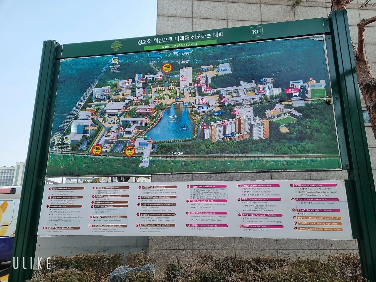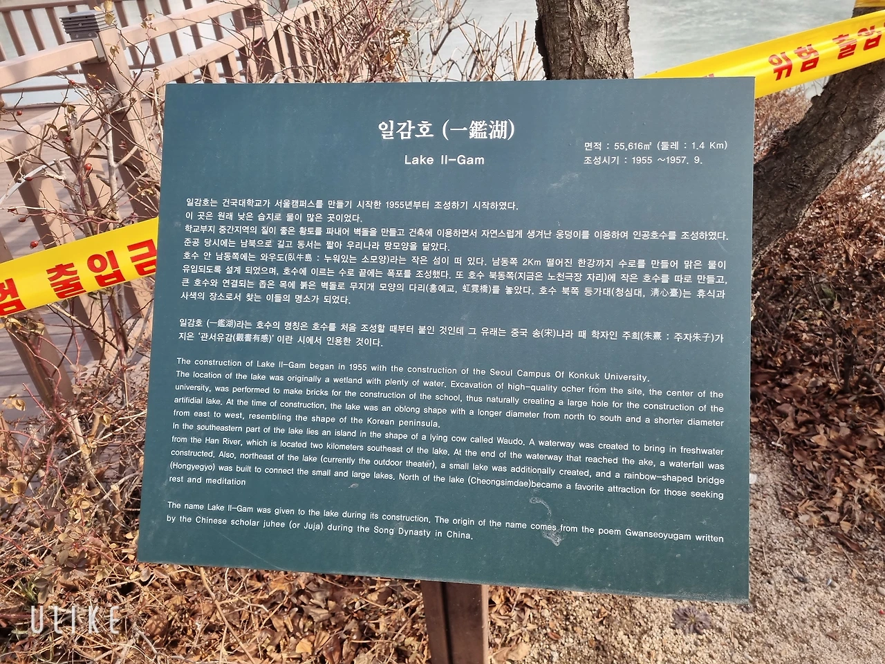 10여 분 정도 걸으니 학교의 모습이 보였다. 큰 규모에 놀랐고, 정말 가운데 커다란 호수가 있었다. 가까이 가보니 정확한 명칭이 '일감호'였다. 건국대학교가 서울 캠퍼스를 만들기 시작한 1955년부터 조성한 인공 호수였다. 원래는 물이 많은 습지 였다고한다. 학교 안에 호수가 있다는 것은 매력적이었다. 답답할 때 호수를 바라보며 마음을 다스릴 수 있지 않을까. 아들과 천천히 그 주변을 돌며 풍경을 눈에 담았다.