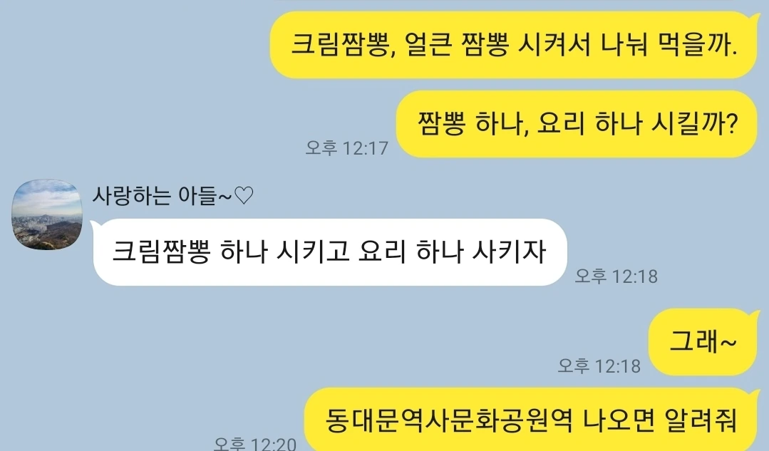 빠른 길 찾기로 몇 가지 가는 방법을 공유했다. 아들은 동대문역사문화공원역에서 2호선으로 환승하는 구간을 택했다. 이때다 싶어 무얼 먹을지도 물었더니 크림 짬뽕을 선택했다. 가는 동안 가끔 카톡으로 대화하고 나는 책을 읽었고, 아들은 핸드폰 게임을 했다. 집에서는 그리 살가운 녀석이 밖에만 나가면 이리 차단기를 내렸다.