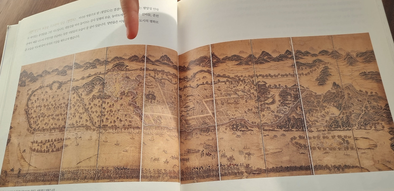 아빠 : 나는 평양의 표정을 고스란히 담은 <평양도>야. 10폭의 널따란 지도 안에 그 시대의 평양의 모습이 담겨있어 흥미로웠어. 선비들이 춤추는 모습이라든지, 군인들이 훈련하는 모습까지 지도가 상세히 그려져 지금도 갈 수 없는 곳에 관한 묘한 관심을 불러일으켰네. 지도를 통해 국가의 기강을 바로잡으려고 했다니. 지도를 보면 정말 그랬을 것 같아.