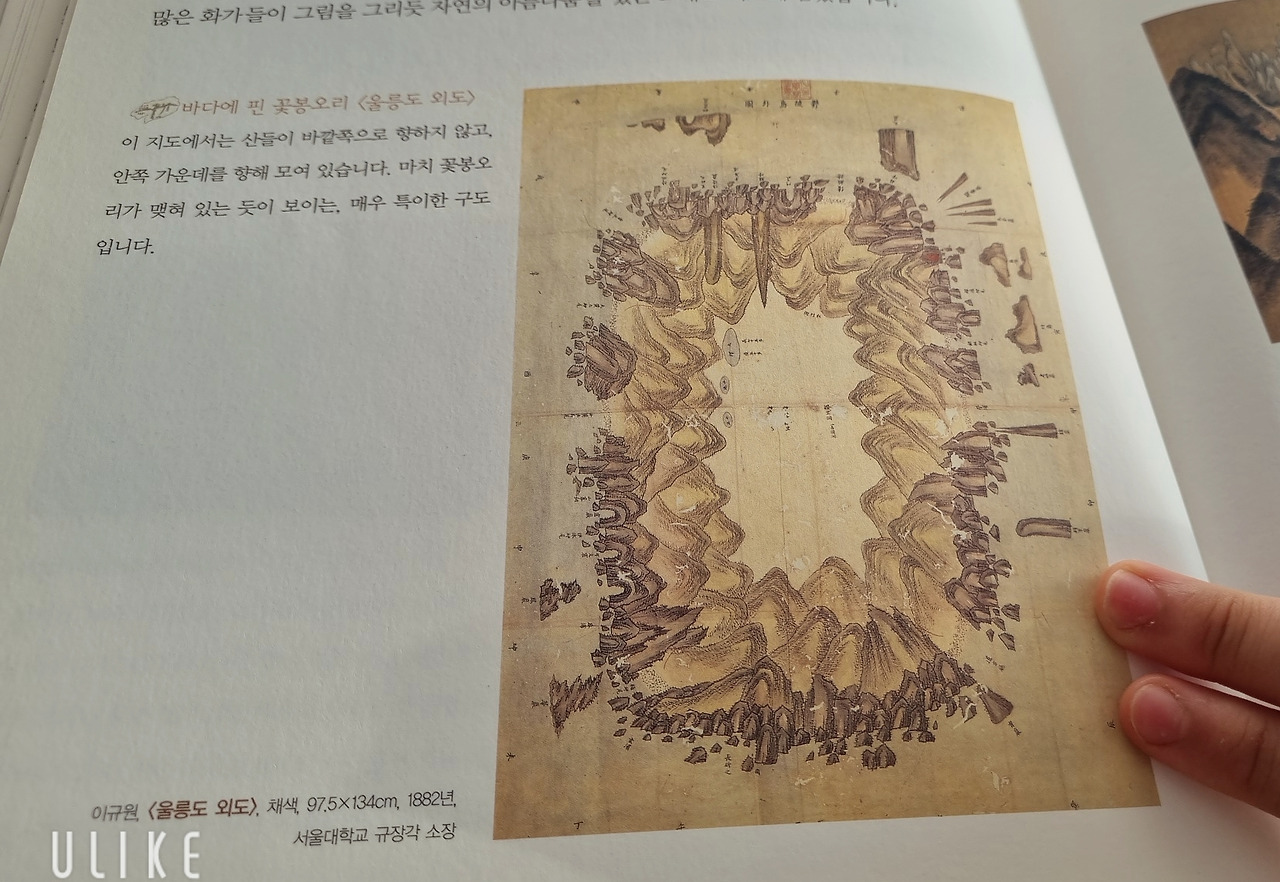 딸 : 나는 <울릉도 외도>가 좋았어. 예쁜 그림을 좋아하는데 이 지도가 그랬어. 산이 바깥이 아닌 안쪽 가운데로 모여서 마치 꽃봉오리 같았어. 지도가 참 여러 종류가 있구나를 알게 되었고.