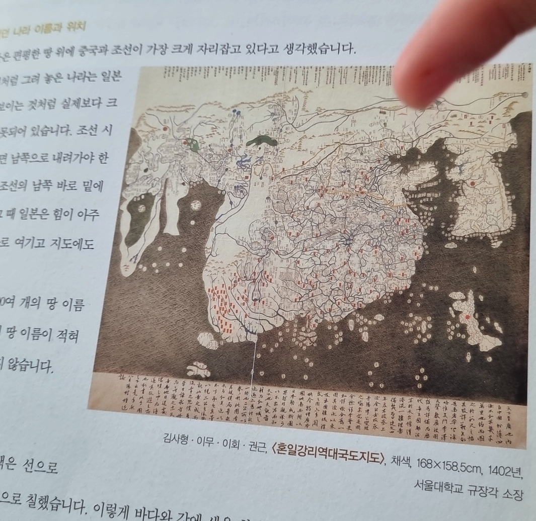 아들 : 나는 <홍일강리역대국도지도>가 인상적이었어. 가장 오래된 세계 지도이기도 하면서 조선시대 사람들이 중국과 조선을 세계의 중심으로 생각하고 크게 나타내고 일본 등 다른 국가는 실제보다 작게 표시한 것이 재밌었어. 책을 읽으면서 지도가 단순히 땅의 모양을 나타내는 것이 넘어 그 시대 사람들의 생각도 담겨 있는 듯해.