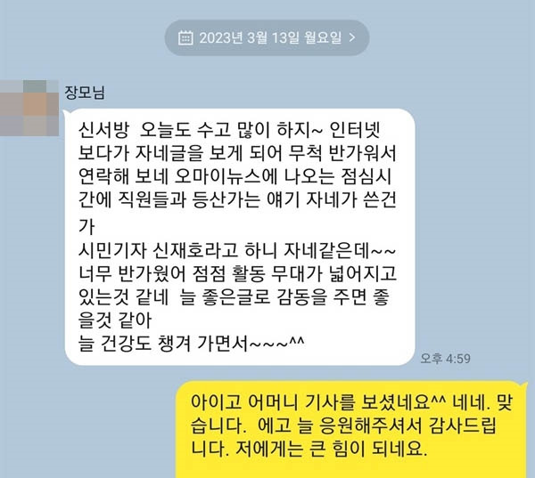 ▲ 우연히 내가 쓴 오마이뉴스 기사를 읽고 장모님이 응원 메시지를 보내왔다. ⓒ 신재호