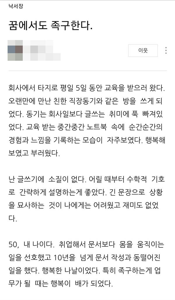 함께 입사한 지 15년이 넘었지만, 근무지가 달라 단편적인 모습만 알았는데 글을 통해 그의 삶을 깊게 이해하게 되었다. 동기 역시도 중년을 지나가며 여러 고민이 있었다. 나와 맞닿은 부분이 많아 공감되었다. 글이란 그런 것 같다. 굳이 설명하지 않아도, 길게 말하지 않아도 쓴 사람의 솔직한 마음이 담기면 그대로 전해졌다.