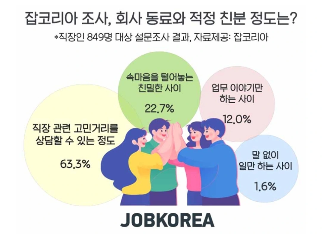 2019년 잡코리아에서 직장인 849명을 대상으로 '회사 동료와 친구가 될 수 있다고 생각하는지'에 관해 설문조사를 했다. 설문 결과 직장인 64%가 '동료와 친구가 될 수 있다'라고 답했다.