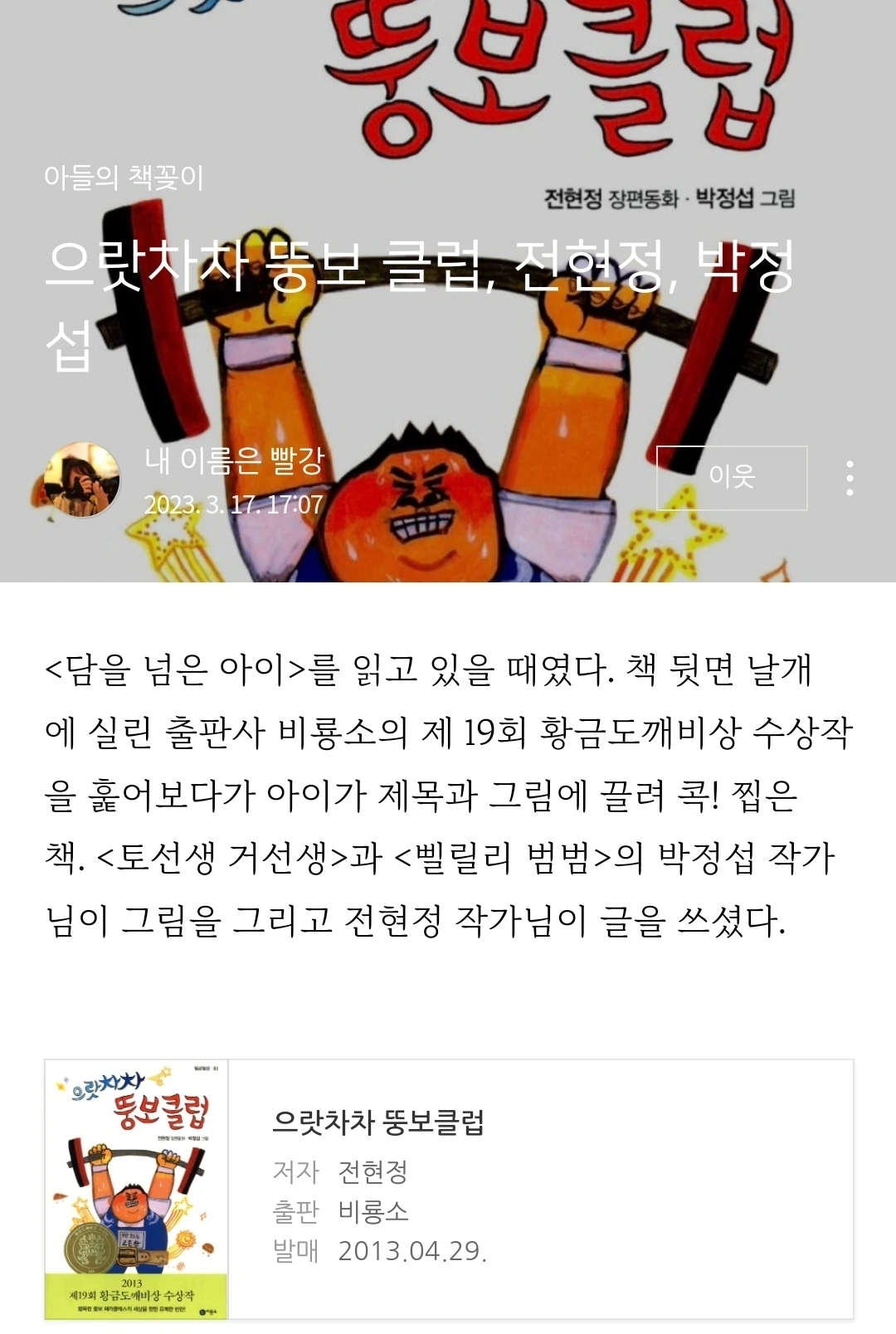 오늘 순서는 나, 첫째, 둘째 순으로 하기로 했다. 나의 책은 '오늘은 좀 매울지도 몰라' 였고, 아들의 책은 '변기에 빠진 세계사' 그리고 딸의 책은 '으랏차차 뚱보 클럽'이었다. 딸은 인터넷으로 검색을 해주었는데 맙소사 거기에 익숙한 이름이 있었다. 글벗 빨강님의 서평이었다. 어찌나 반갑던지. 아이들에게 아는 분이라고 자랑을 했다.