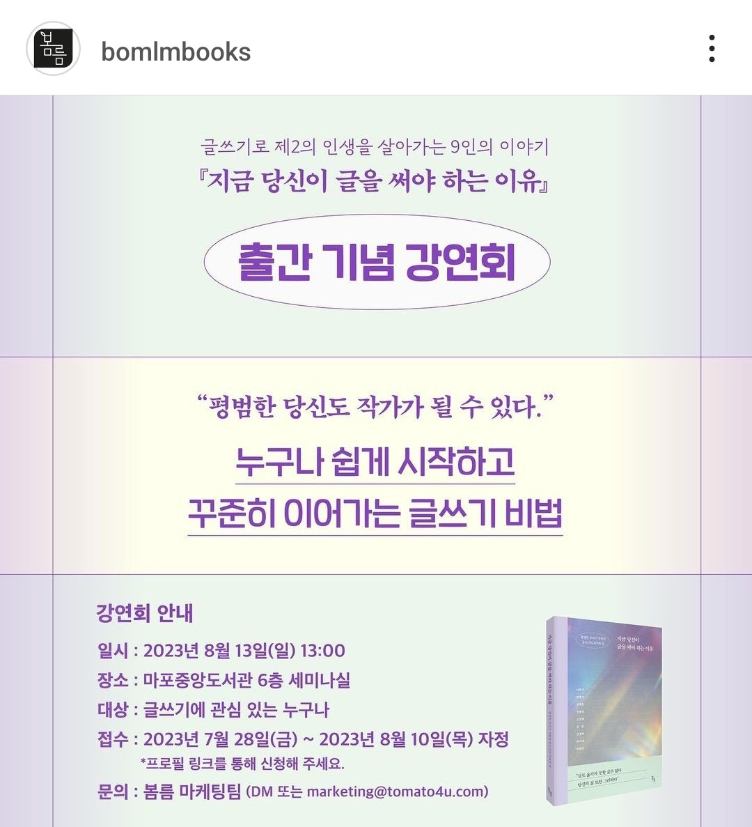 "평범한 당신도 작가가 될 수 있다" 《지금 당신이 글을 써야 하는 이유》 북토크 신청 링크 안녕하세요, 봄름 출판사입니다. 『지금 당신이 글을 써야 하는 이유』 출간 기념 강연회에 초대합니다. 『지금 당신이 글을 써야 하는 이유』 저자들이 모여 ✨누구나 쉽게 시작하고 꾸준히 이