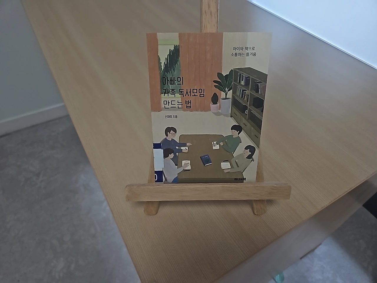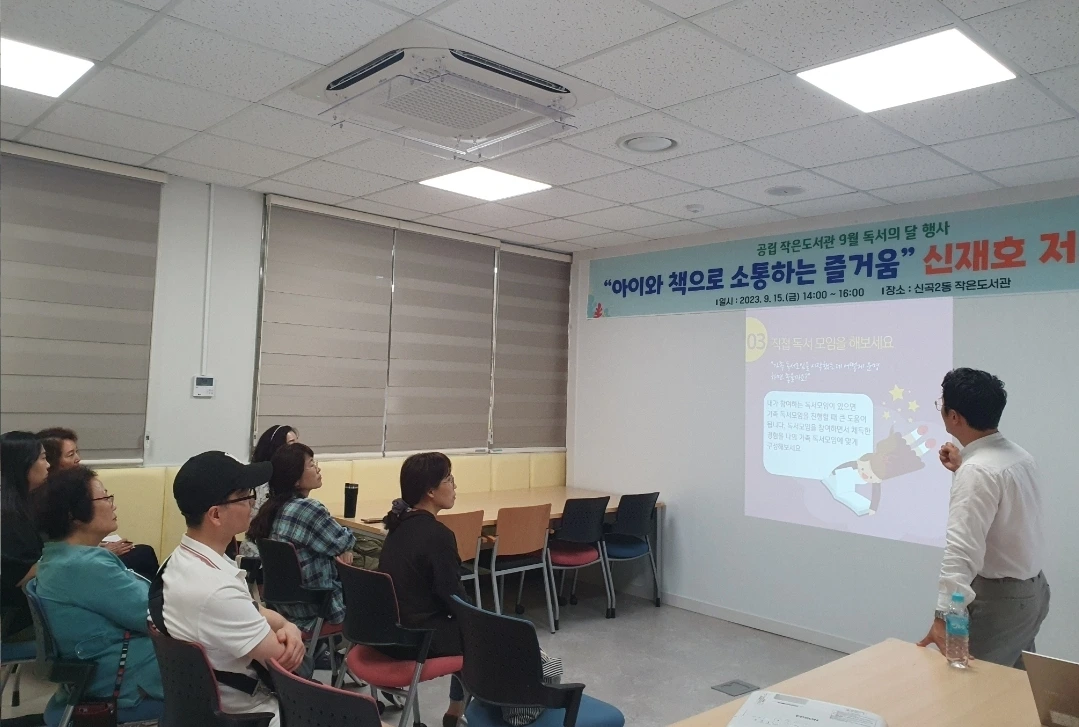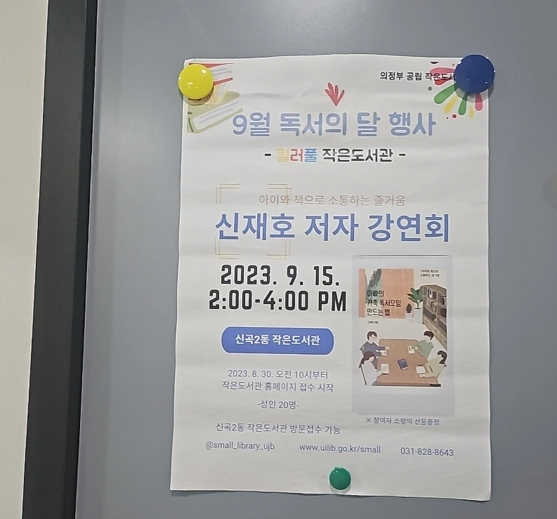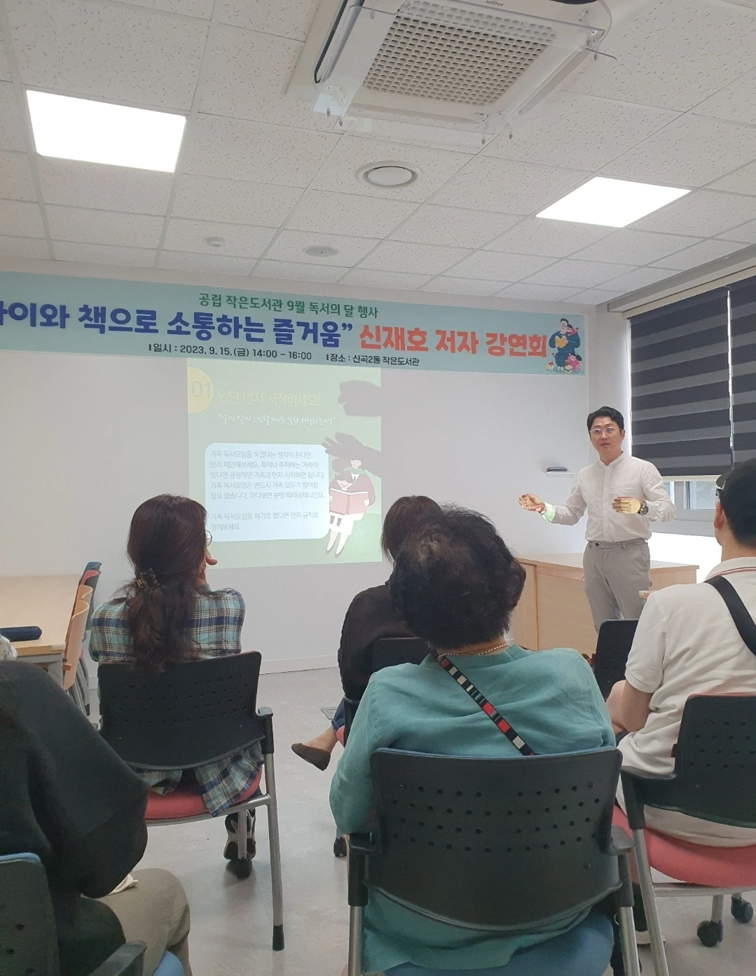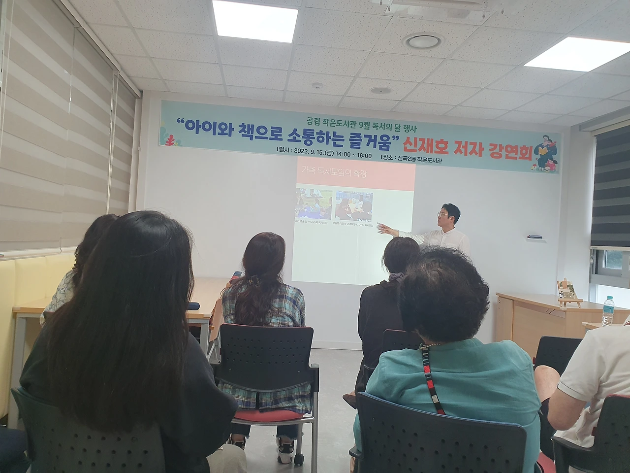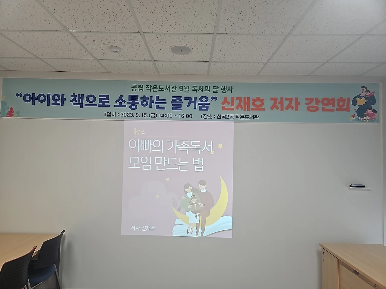 생각보다 이른 시간이었다. 유리창 너머로 보이는 도서관 내부가 참 예뻐서 슬쩍 구경을 하려다가 그만 담당 선생님을 마주했다. 그분의 손에 이끌려 강의장으로 향했다. 눈앞에 바로 현수막이 보였다. 탁자 위에는 '아빠의 가족 독서모임 만드는 법'책도 놓여 있었다. 매번 이 순간이 왜 이리 부끄러운지 모른다.