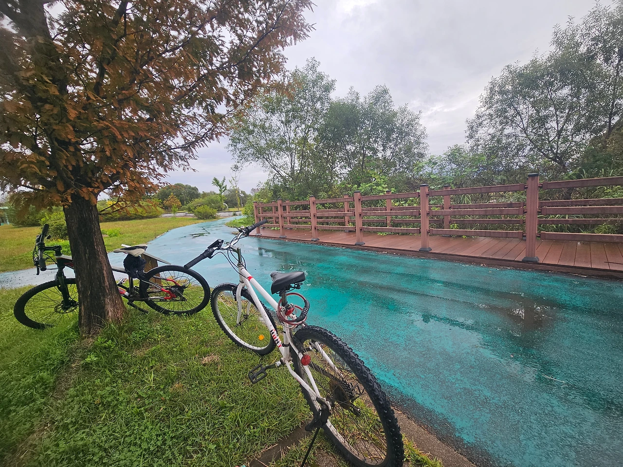 옷을 갈아입고, 천천히 라이딩을 시작했다. 전 날 맑다는 일기예보와 달리 하늘이 찌뿌둥했다. 시원한 바람을 가로질러 공지천 초입에 들어설 무렵, 비가 쏟아지기 시작했다. 옅은 비는 갈수록 짙어졌다. 하지만 우리의 길을 막을 순 없었다. 아니. 오히려 비가 와서 시원하고 좋았다. 많이 쏟아지면 잠시 나무 밑에서 피하면 그만이었다.