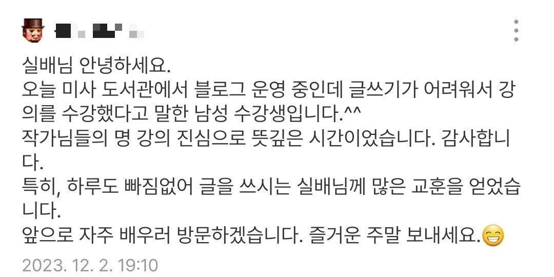 잠시 쉬고 있을 때 블로그 알람이 울려 열아보니 고마운 댓글이 있었다.강의 때 질문했던 남자 관객분이 블로그에 찾아와 글을 남긴 것이었다. 이 감동을 어찌할꼬.