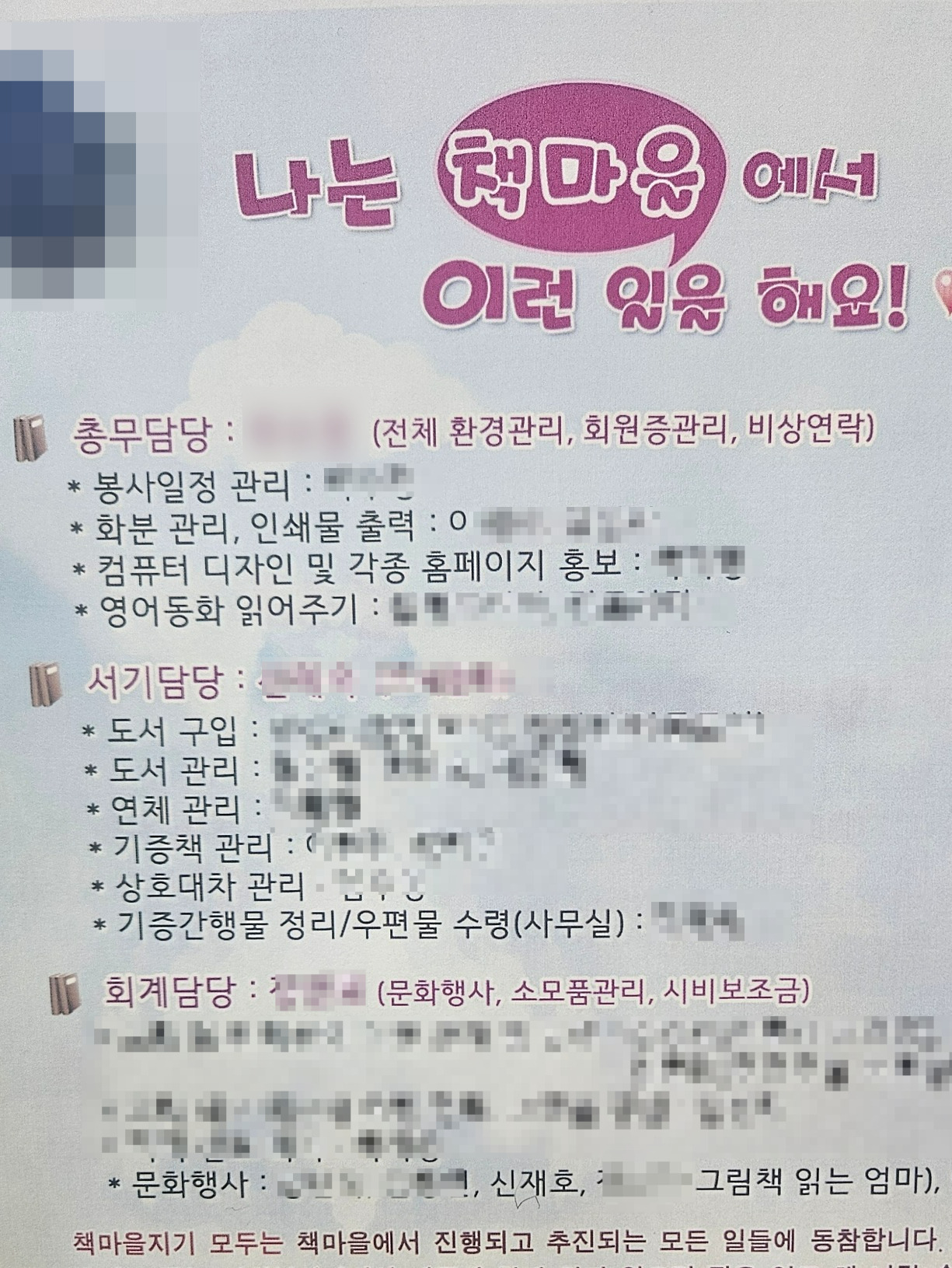 정말 그랬다. 단층에 작은 구석에 위치한 동네 도서관이 이 정도일지 상상하지 못했다. 그 뒤로 총무님은 A4용지 빼곡히 적어온 내용을 공유했다. 작년 회계결산을 시작으로 올해 봉사자들이 맡은 개별 역할이 적힌 종이를 나누어 주었다. 그 안에 나는 문화행사 안에 이름이 들어가 있는 것이 아닌가.
