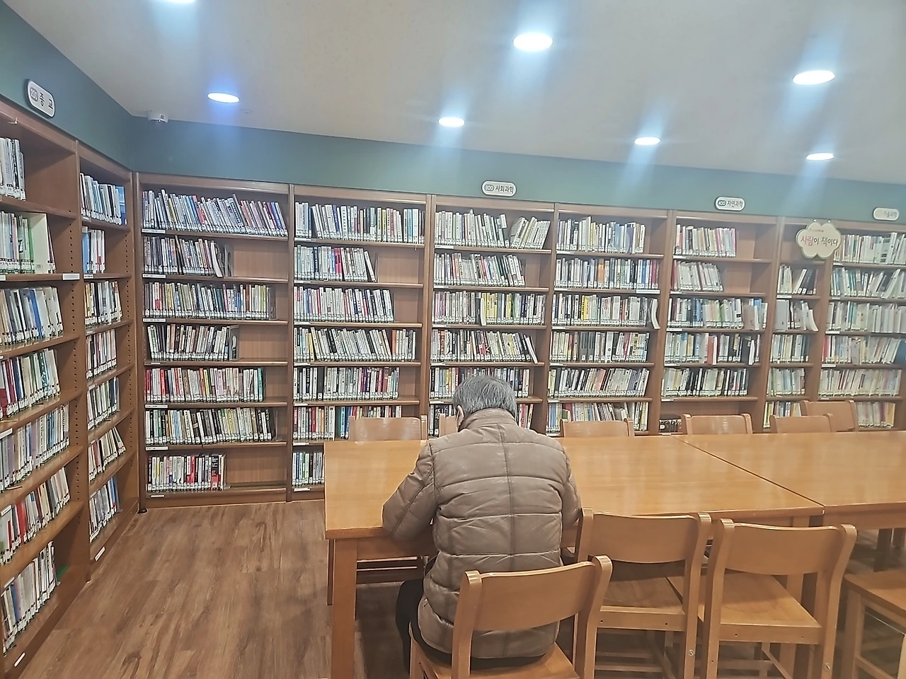 짧은 기간 중 가장 인상 깊었던 분은 머리카락이 새하얗게 샌 나이 지긋한 할아버지 회원분이었다. 도서관이 문 닫기 30분 전쯤에 오셔서 이것저것 물어보시다가 회원증도 만들고, 비치한 돋보기도 빌려갔다. 구석 한편에 자리 잡고 열심히 독서를 시작했다. 책장 정리하면서 슬쩍 그 뒷모습을 남겼다.