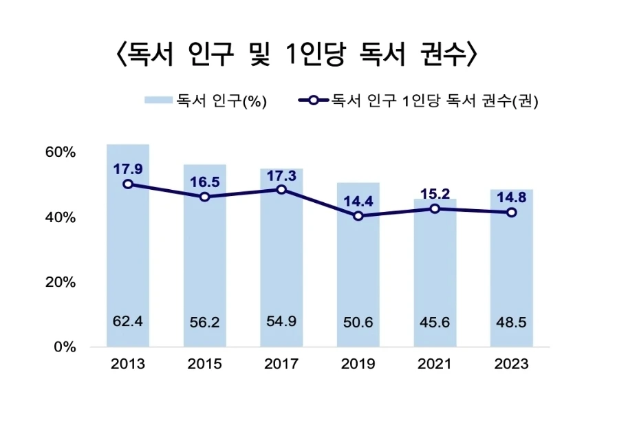 2023년 통계청 사회조사보고서에 따르면, 13세 이상 인구의 절반 이상은 독서를 하지 않았다. 독서 인구 1인당 평균 독서 권수는 14.8권으로 2년 전보다 0.4권 감소하였고, 10대는 3명 중 2명, 50대 이상은 절반 이하가 지난 1년 동안 책을 읽었다고 응답하였다.