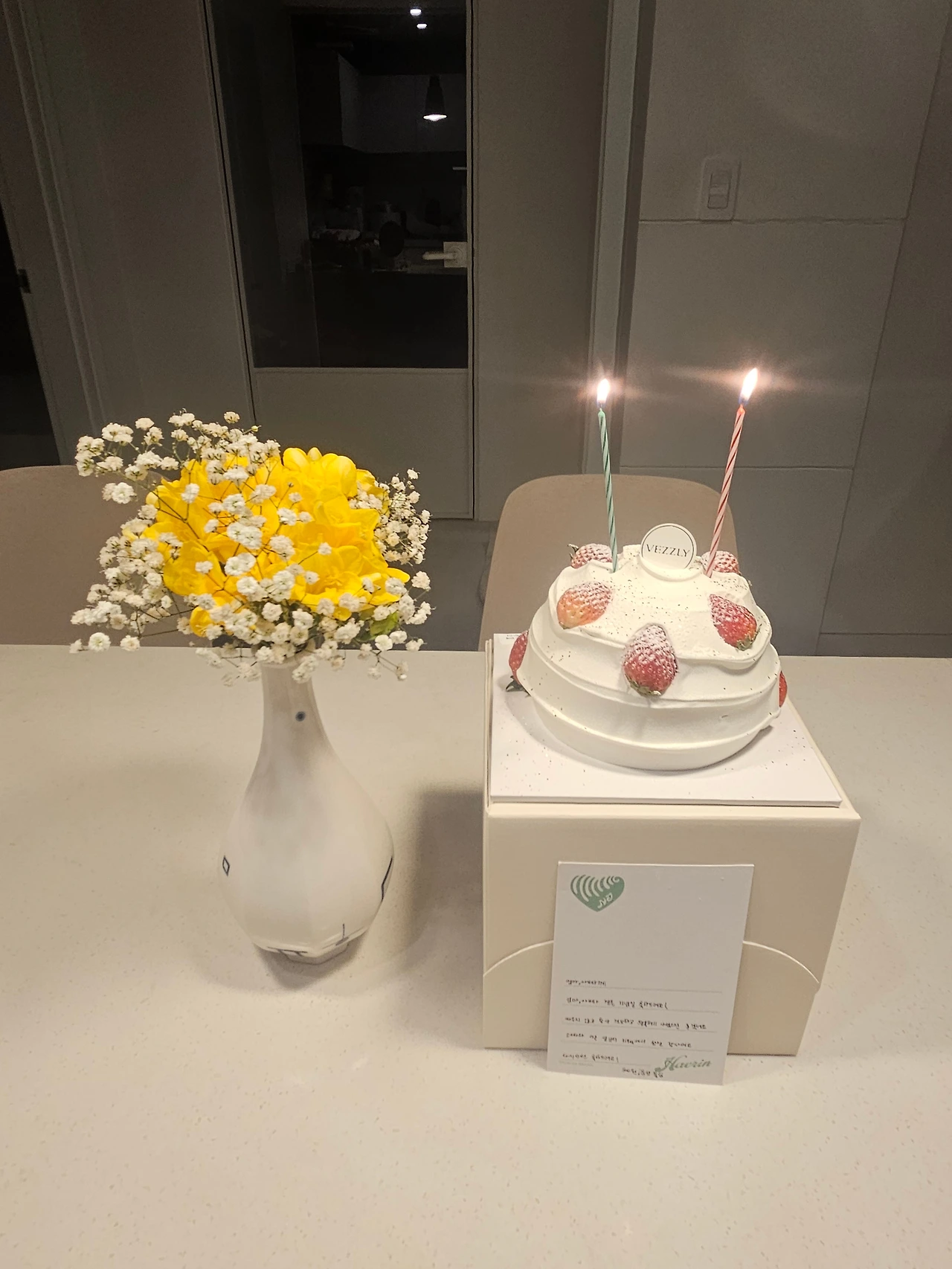 집에 돌아와 잠시 쉬고 있으니, 딸이 나와 아내를 안방으로 내몰았다. 조금 있다 나오라고 해서 부를 때 가보니 식탁에 케이크를 준비해 놓았다. 두 번째 서프라이즈였다. 어떻게 불러야 할 하나 고민하다가 생일 축하 노래에 맞추어 기념일로 개사했다. 카드까지 준비해서 읽어보았더니 잘 키워주어 고맙단 글 사이에 싸우지 말고 행복하게 잘 지내란 문구가 눈에 확 띄었다. 웃어야 할지 울어야 할지.
