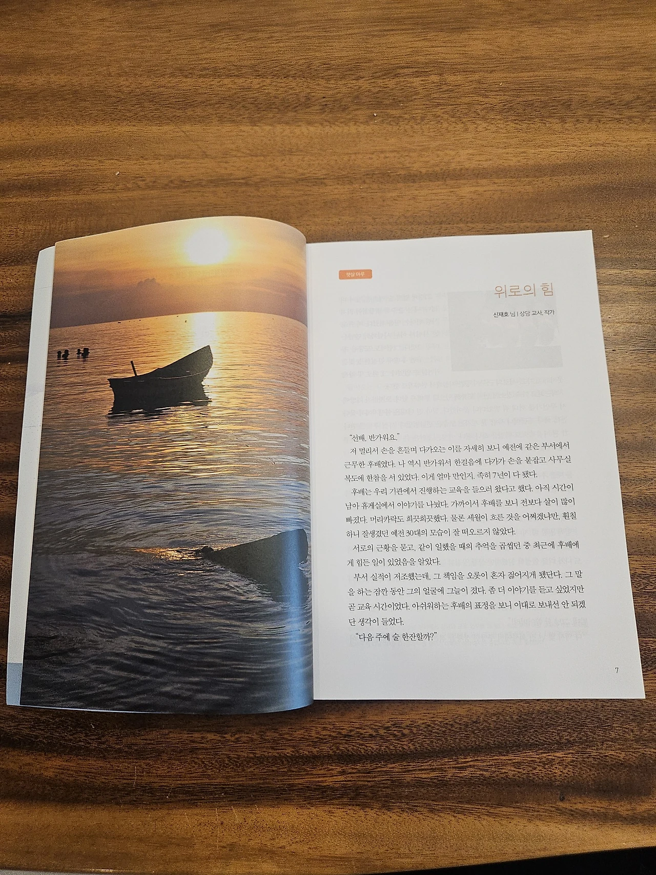 얼른 잡지를 열어보았다. 맙소사 내 글이 제일 앞 장에 배치되었다. 제목도 내가 쓴 그대로 '위로의 힘'이었다. 멋들어진 사진과 배치되니 글이 더욱 생생하게 다가왔다.