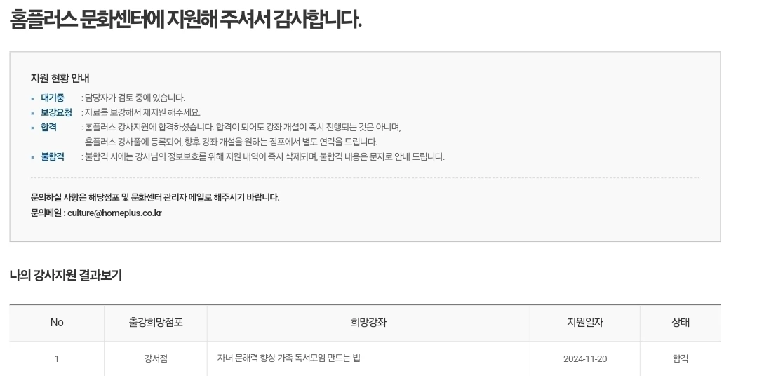 시간이 흘렀고, 지원했던 기억마저 흐릿해질 때쯤 문화센터 담당자에게서 메일을 받았다. 올린 서류 중 수정사항이 있어서 정정해서 다시 올려달라는 글이었다. 과정 중에 몇 번 오류가 발생해서 우여곡절 끝에 완료를 했다. 며칠 뒤 결과가 궁금해서 담당자에게 연락을 했고, 합격 소식을 들었다. 두 달 만에 들려온 기다렸던 소식이었다.