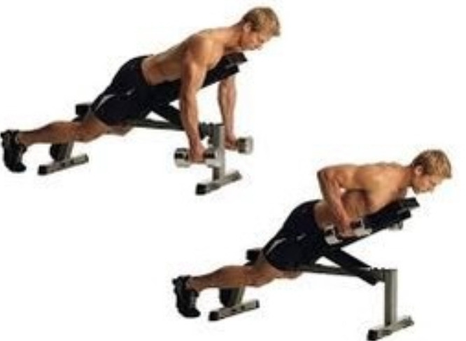 트레이너는 비스듬한 의자에 무릎을 꿇고 가슴을 기대라고 했다. 그리곤 덤벨을 양손에 쥐어주고는 올리면서 가슴을 최대한 피라고 했다.