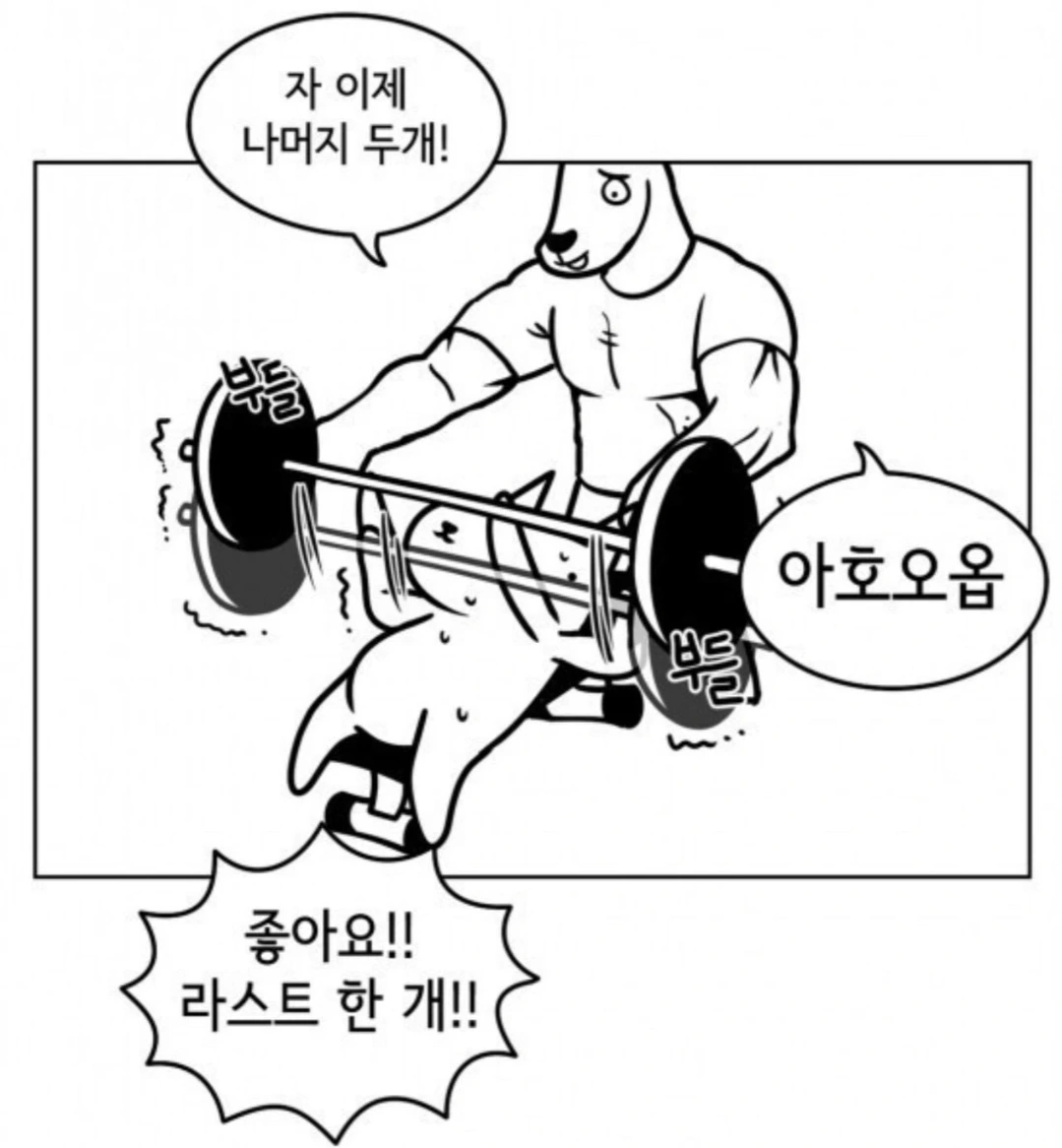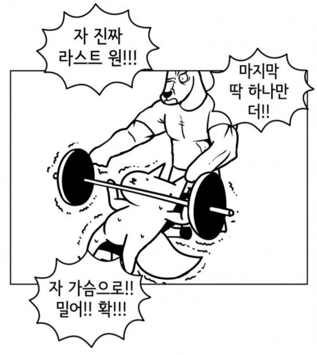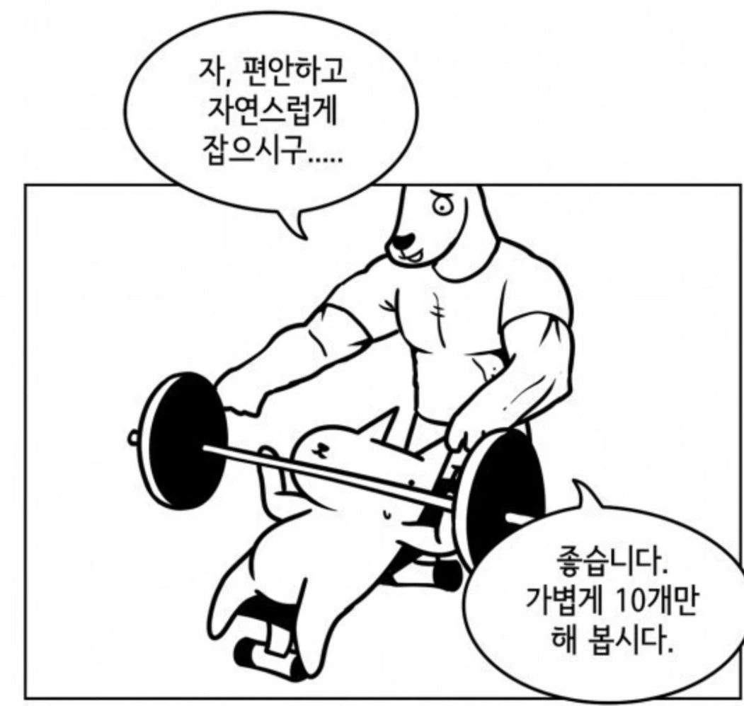 그 당시엔 동료가 조금 과하게 생각하는 건 아닌가 생각했었는데 PT를 받아보니 지금에서야 무슨 말인지 이해가 되었다. 당연히 트레이너가 놀리려는 의도는 없었겠지만 당하는 입장에선 부지부식 간에 그런 마음이 들기 마련이니. 나 역시 극한을 마주할 때마다 무슨 부귀영화를 누리려고 생고생을 사서 하는지 하는 생각을 반복하곤 했다. 오죽하면 헬스장에서 그에 관한 유머가 돌까.