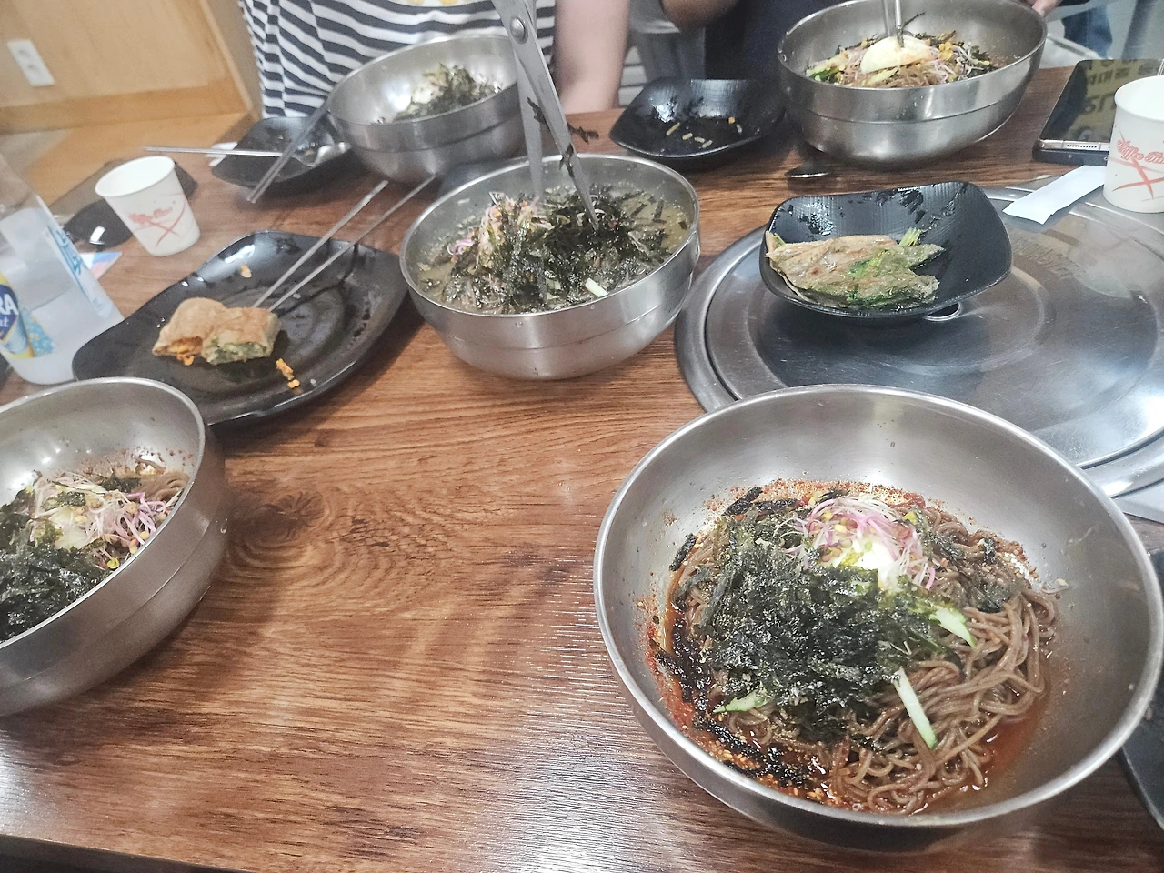 모든 관람을 마치고 화요일 작가님이 추천한 막국수 집을 갔다. 주변의 많은 음식점 중에서 유독 이곳만 붐볐다. 번호표를 받고 기다리다 들어갔다. 막국수를 포함 골고루 다른 메뉴도 맛보았다. 하나하나 어찌나 맛나던지 입이 쉴 틈이 없었다.