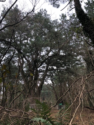 이렇게 들으면서 묘지를 지나면 무섭지도 않고, 거부감없이 둘레길을 지나는 중일 것이다. 묘지터를 지나고 다시 나무 숲으로 드러서면 좌측에 두그루의 마을 보호수를 볼 수 있다. 사실 마을보호수면 마을 안에 있기 마련인데, 선흘2리의 마을보호수는 이 곳에 있다. 200여년이 넘은 수령의 보호수는 핸드폰 한 프레임안에도 담을 수 없는 커어어다랗다.