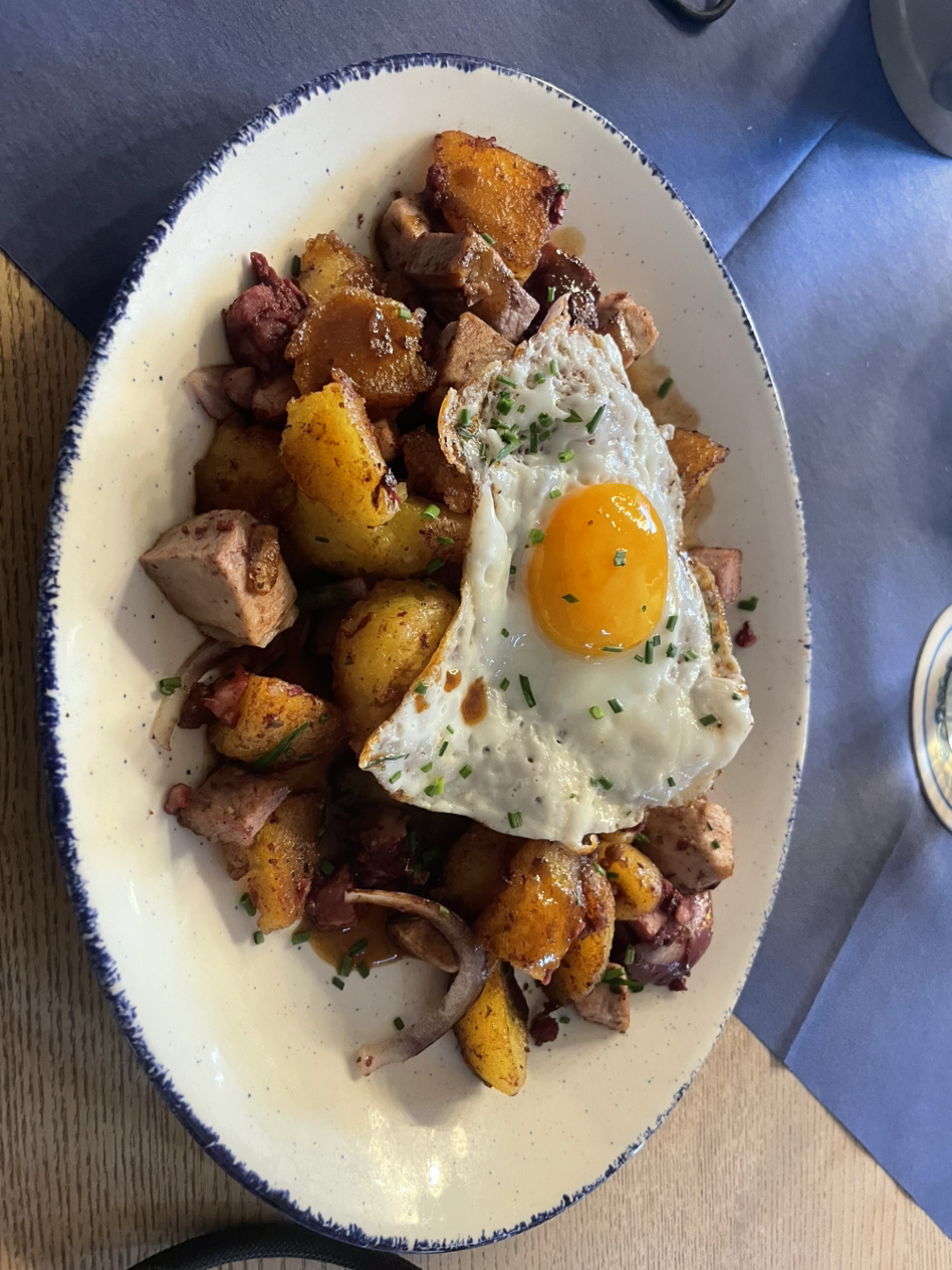 돼지고기와 소시지, 감자를 네모나게 썰어서 볶아주는 음식이었다
