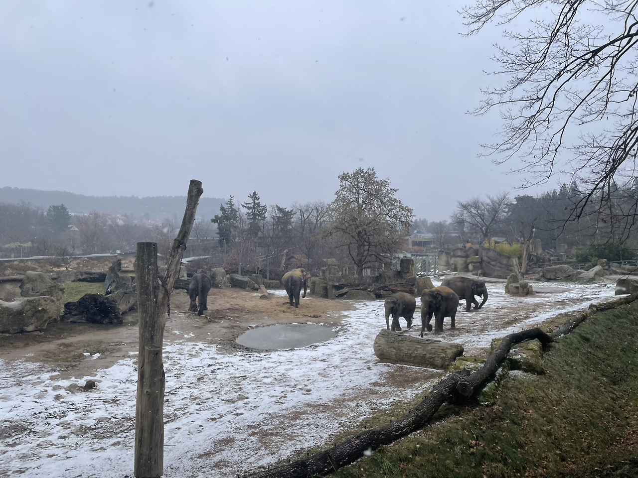 아프리카에서 따뜻한 곳에 있는 모습만 보다가 눈이 내리는 곳에 있는 코끼리를 보니 또 새로웠다