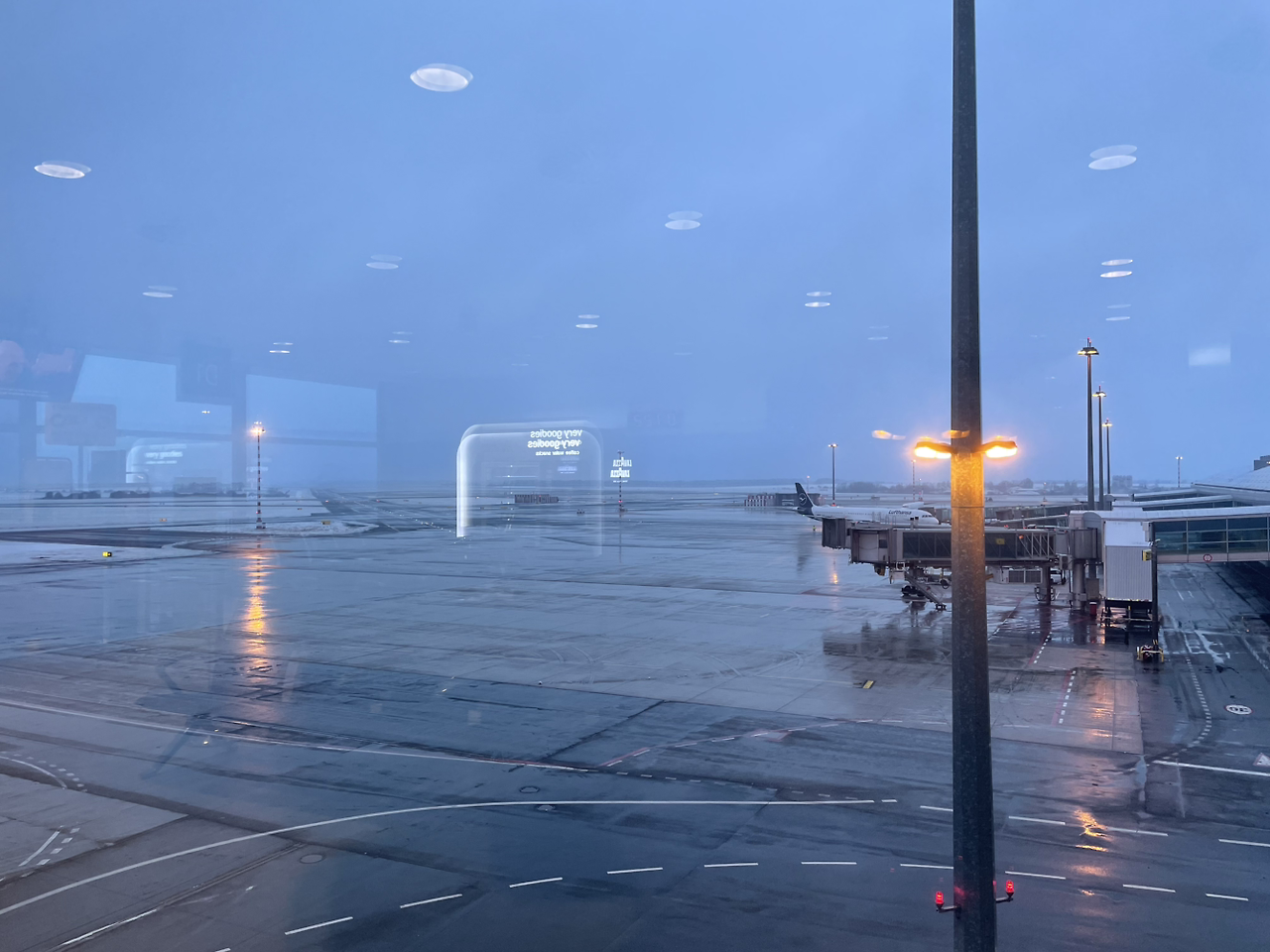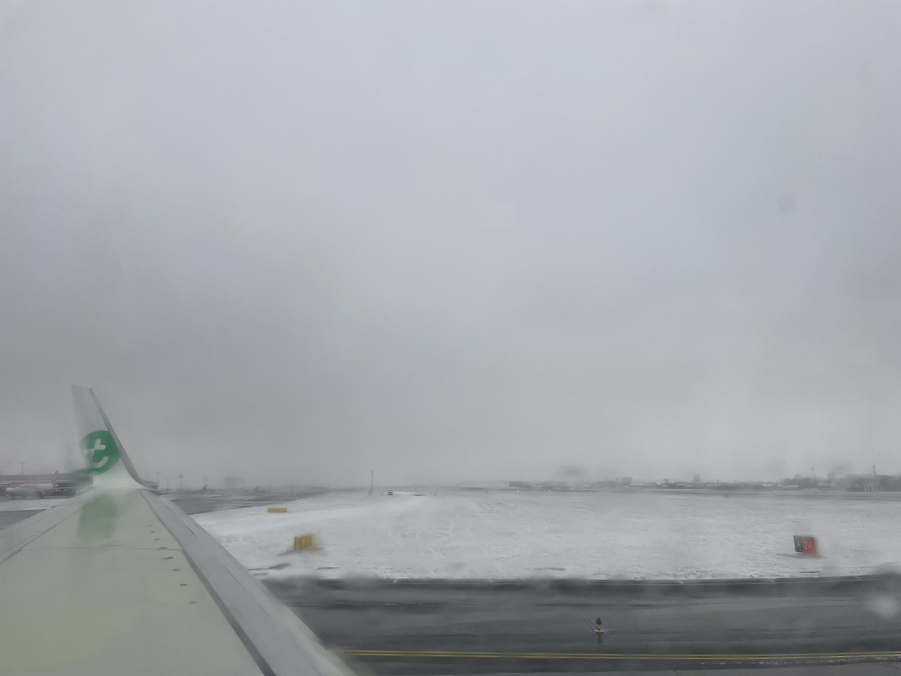 창문 밖으로 공항 활주로를 바라보니 잔디 구역에 눈이 제법 쌓여있다