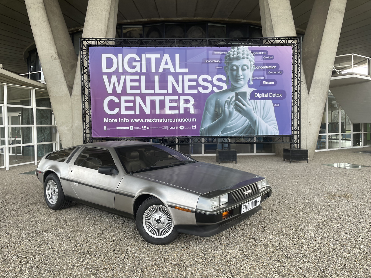 건물 밖의 현수막에 부처의 그림과 디지털 디톡스와 같은 글귀가 쓰여 있었다