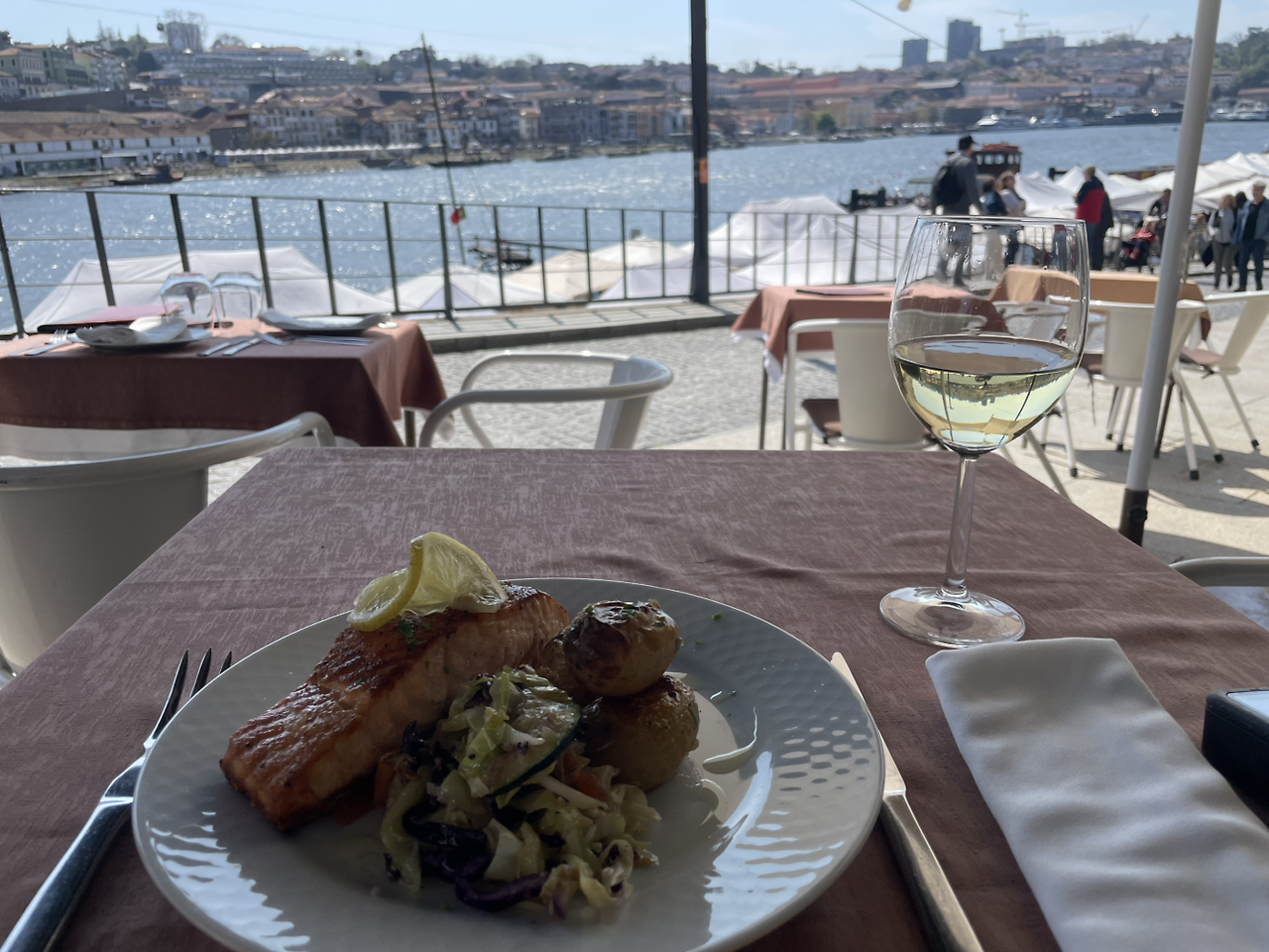 이곳에서 연어요리와 화이트와인 한잔을 주문했다