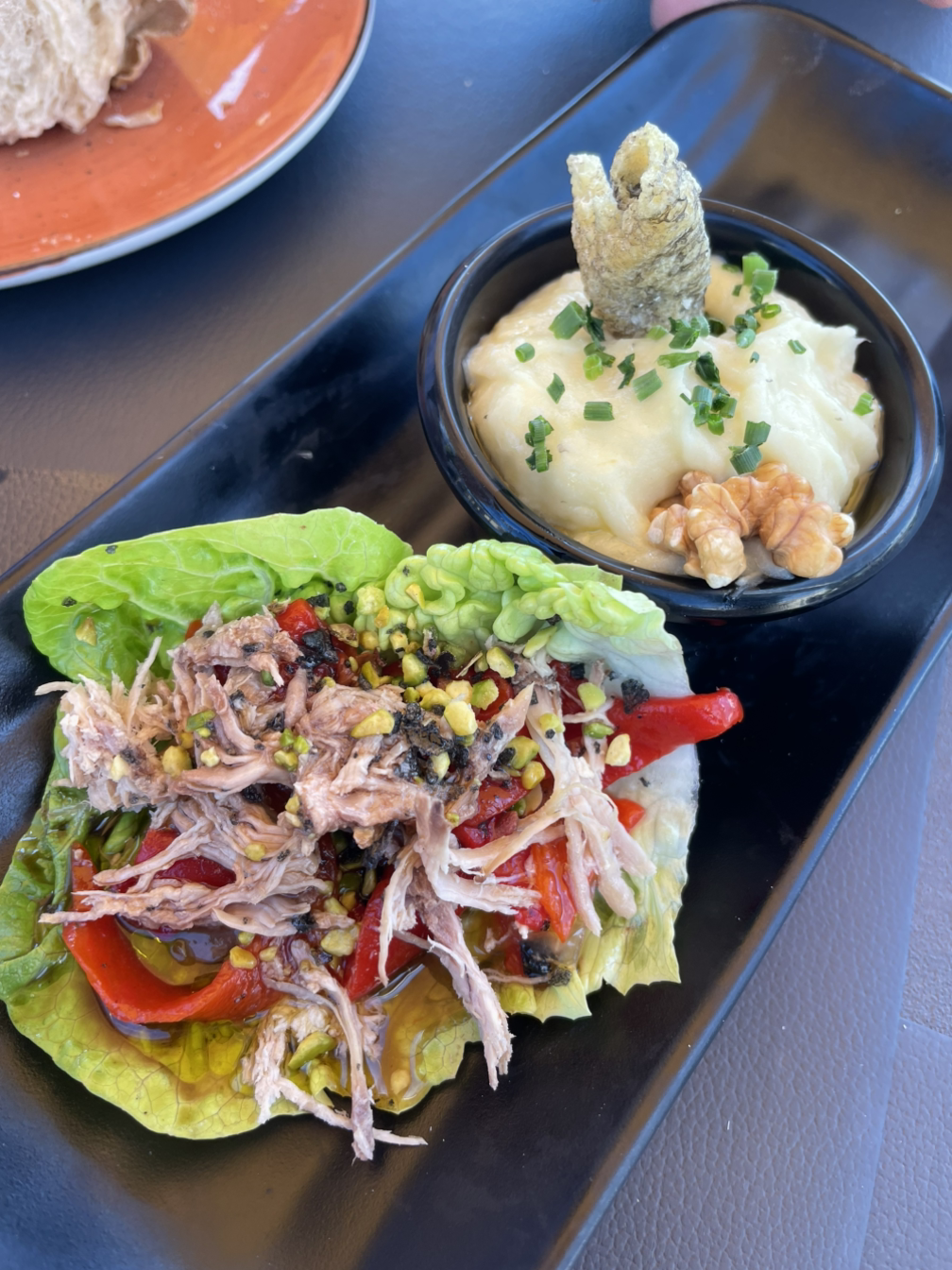 애피타이저로 감자와 마늘 그리고 대구살을 갈아서 만든 음식과 상추에 상큼한 소스를 곁들인 메추리고기를 먹었다