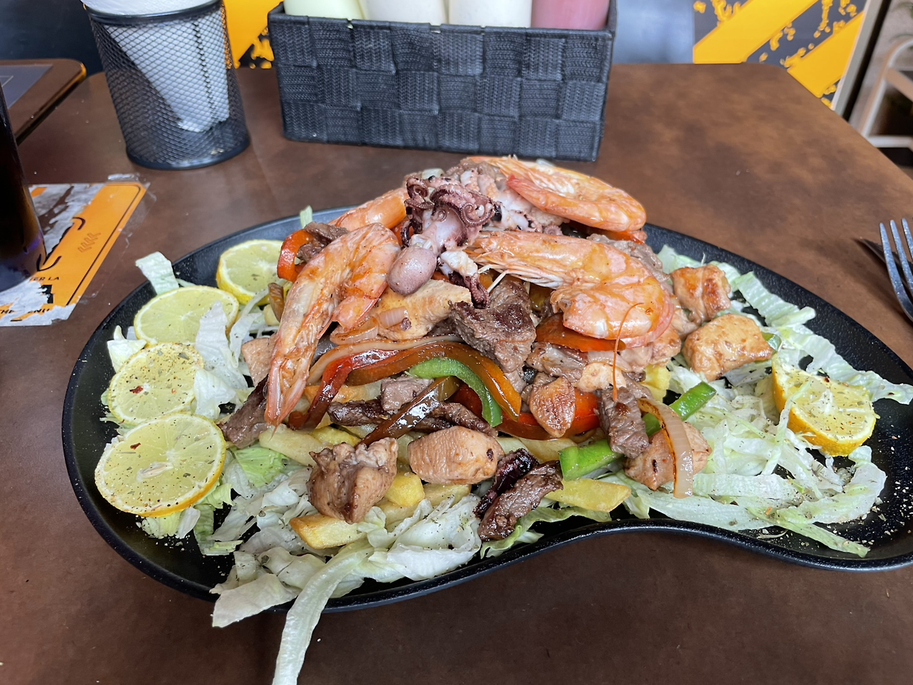 소고기, 닭고기, 새우, 주꾸미, 감자튀김, 양상추가 뒤섞인 음식이 나왔다