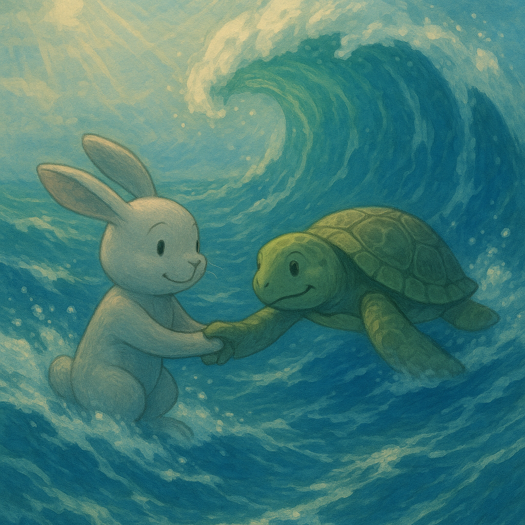 토끼와 거북이는 서로서로를 의지하며,