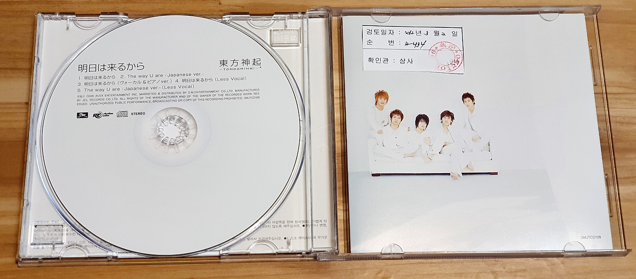 왜색 논란(?)을 빚은 동방신기의 일본 싱글 앨범 <明日は来るから>. 보안심사를 거쳐 우측의 스티커를 받아야만 부대 내 소지가 가능하다