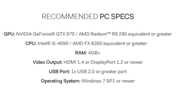 바이브 역시 PC 기반이기 때문에 고사양 PC가 필요하다는 점이다. 요구하는 사양은 리프트와 거의 동일하다.