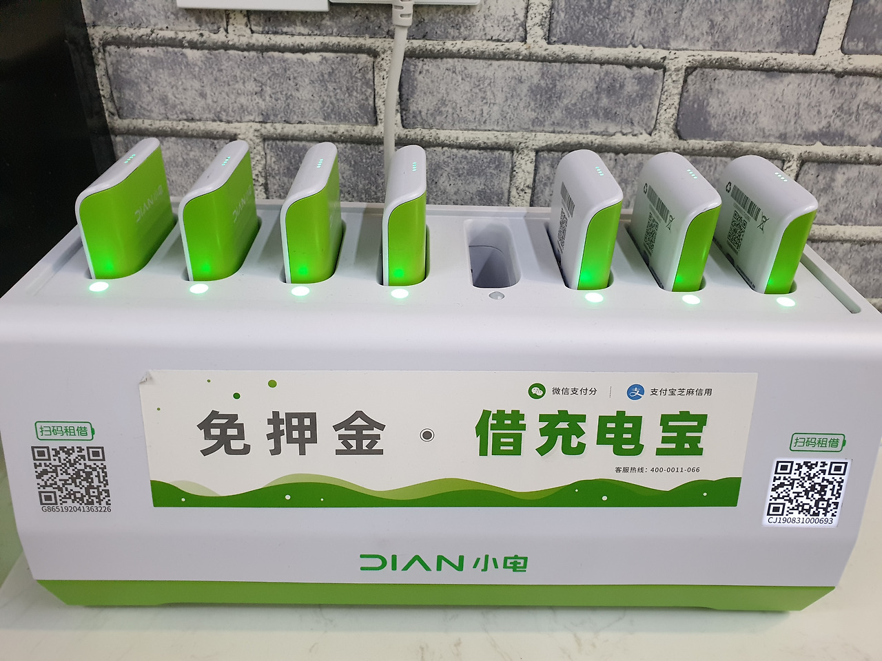 이처럼 휴대폰으로 많은 일들을 해결하기 때문에, 휴대폰의 배터리가 아주 중요하다. 이에 따라, 여러 상점에서 대여용 보조배터리 기계가 배치되어 있는 것을 볼 수 있다. 이것도 마찬가지로, 기계의 큐알코드를 스캔하여 잠금이 풀리는 보조배터리를 대여하여 사용 후(보통 1시간에 3위안(한화 약 500원)), 이동을 하게 되는 경우에도 다른 지점에서 반납이 가능하다. 가방에 무거운 보조배터리를 종일 들고 다니는 수고를 덜 수 있지만, 배터리가 아주 나갔을 때에는 스캔마저 하지 못한다는 단점이 있어, 근처의 사람들에게 부탁하여 대여 후 전원이 켜지면 돈을 보내주는 광경이 목격되기도 한다.