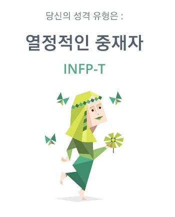 16가지 유형 가운데 '열정적인 중재자(INFP-T)가 나왔다. 열정적인 중재자는 최악의 상황이나 악한 사람에게서도 좋은 면만을 바라보며 긍정적이고 더 나은 상황을 만들고자 노력하는 진정한 이상주의자라고 한다. 그리고 간혹 침착하고 내성적이며 수즙음이 많은 것처럼 보이지만, 불만 지피면 활할 타오를 수 있는 열정의 불꽃이 갖고 있다고 한다. 또한 열정적인 중재자는 자기 자신에 대한 깊은 통찰력과 다수가 아닌 소수에 더 많은 관심을 갖고 있다.