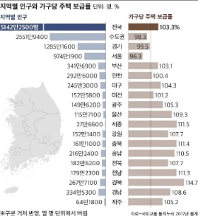 이 자료를 보면, 5142만 2500명 중 수도권(경기도, 서울특별시, 인천광역시) 인구가 2551만 9400명에 이른다. 통계 작성 후 3년의 기간 동안 수도권 인구는 전체 인구의 50%를 넘어섰다. 인구가 수도권에 과밀화되는 현상 때문에 서울 집값을 비롯한 수도권 주택 가격이 고공행진을 하고 있다. 그와 더불어 가구당 주택 보급률도 100% 이하로 떨어졌다. 결국 수요와 공급 모두 문제가 있다고 볼 수 있다.