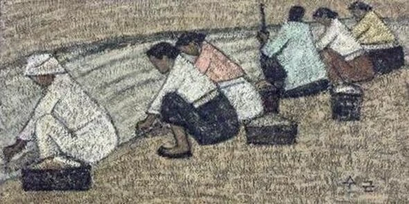 시를 이해하기 위해서는 박수근 화백의 그림을 우선 볼 필요가 있다. 화백의 그림은 향토적 인물의 표정이 드러나지 않는 평면적 구도의 그림이다. 원근법이 사용되지 않았기에 특히 더 납작해 보인다. 또한 그림의 재질과 색감 역시 화면에 딱 붙은 듯하기에 이러한 세계의 독특함을 더한다. 시는 이러한 화백의 그림을 회화적으로 묘사한다. 다시 말하자면, “박수근적 방법론으로 대상을 볼 때 어떤 결과를 빚어내느냐다.”