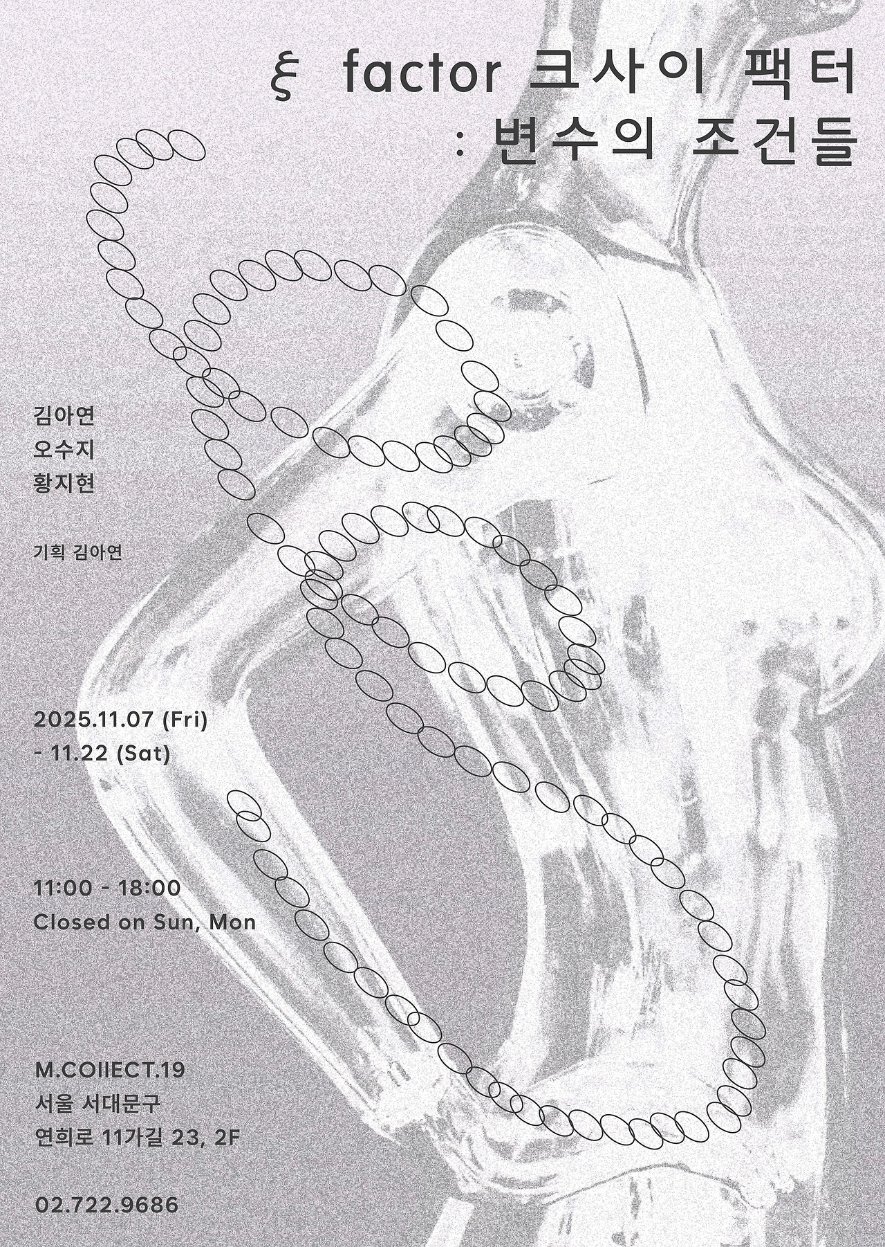 수학과 물리학에서 ξ(크사이)는 예측 불가능한 '변수', 때로는 '잡음'을 뜻하는 그리스 기호입니다. 고정된 값이 아니라 맥락에 따라 변화하며 새로운 의미를 생성하는 자리이기도 합니다. 이때 ξ(크사이)는 "Xi(ξ)", 혹은 "크시"라는 과학적 기호가 '사이(between)'라는 철학적·관계적 개념으로 확장된, 일종의 언어적 혼종(hybrid)으로 읽힐 수 있습니다. 전시는 이 기호를 회화의 언어로 번역하며, 세 작가의 작업이 불완전성 속에서 어떻게 살아 움직이고 관계 맺는지 탐구합니다.