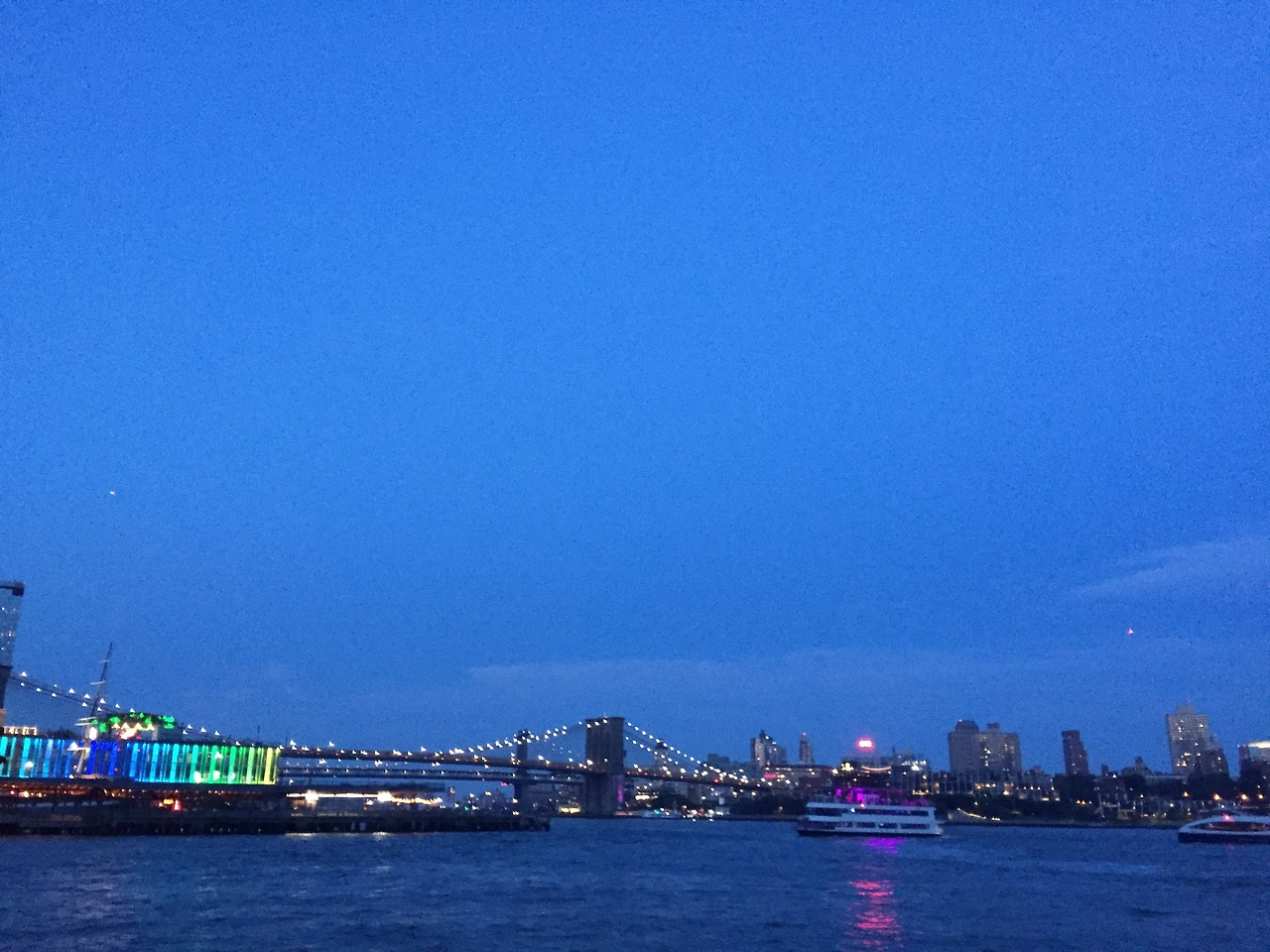 숙소에서 아저씨가 뉴욕 페리가 새로 생겼다는 정보를 주셨다. 뉴욕 시에서 운영하는 페리라 가격이 2.75달러밖에 되지 않는다. 그래서 이왕 월스트릿에 온 것 페리를 타고 숙소로 돌아가기로 정했었다. 페리를 기다리는 곳에서 멀리 브룩클린 브릿지가 보인다. 한편 사진 속 무지개색으로 빛나는 곳에선 마이클 부블레의 공연이 한창이었다. 멀리서나마 공짜로 그의 연주를 들으며 야경을 즐겼다.