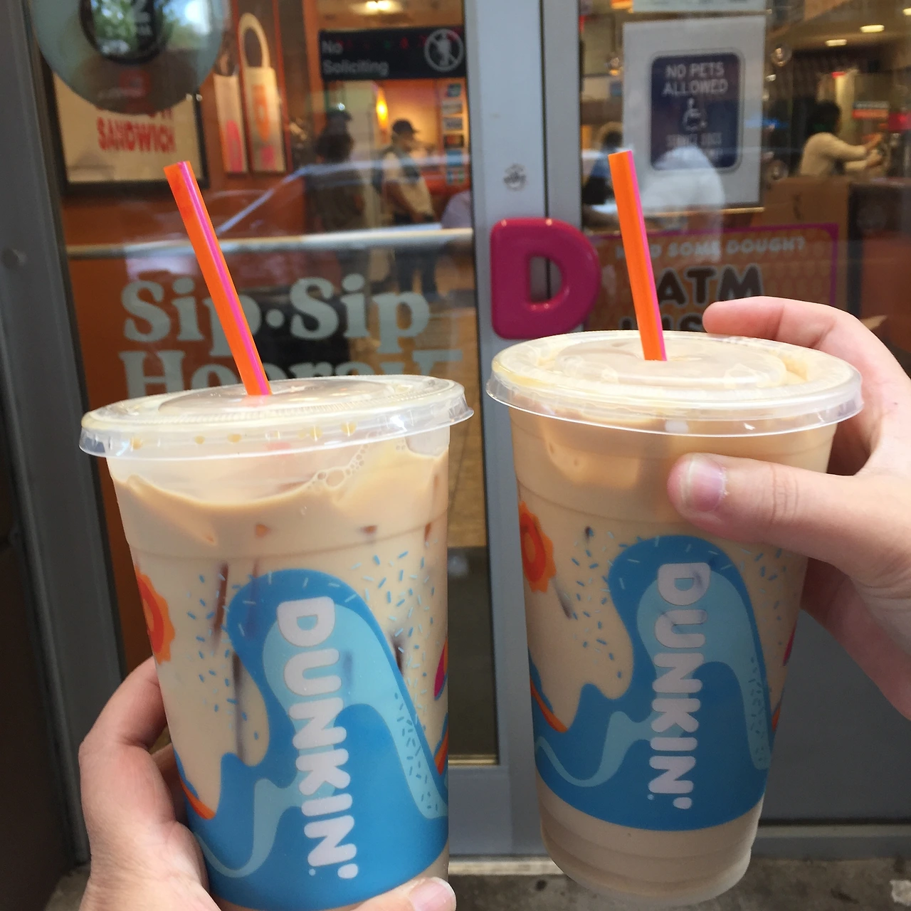 숙소에서 잠시 땀과 어깨를 식히고 맨하튼으로 향하는 길에 발견한 던킨이 너무도 반가웠다. 동행자도 캐나다에 없는 던킨이 반가웠는지 같이 아이스라떼를 주문하였다. 쓰읍 한 입 빨아올리는데 순간 행복을 느낄 수 있었다.