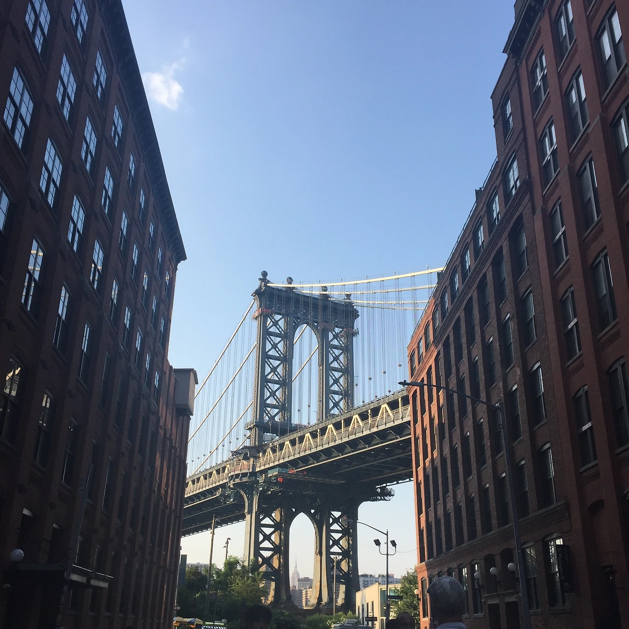 하지만 이번에는 제대로 찾아왔고 다리 사이로 엠파이어 스테이트 빌딩까지 알차게 넣어서 사진도 찍었다. 다른 관광객들이 찍어온 덤보사진들을 보았을 때는 이게 무슨 의미가 있을까 하면서 여우가 포도나무를 보듯 감흥이 없었지만 막상 가보니 그 포도는 달디 단 머루포도였다. 양 옆에 건물이 커서 웅장한 느낌을 주고 아치 모양의 다리 조형물이 주는 아름다움까지 관람할 수 있는 명소였다.