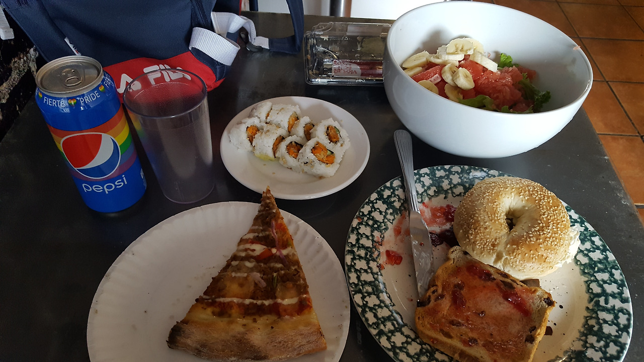 점심으로 한 상 거하게 먹었다. 피자 한 조각을 사고 어제 남은 콜라 한 캔과 자몽과 양상추, 바나나와 함께 어제 받은 롤까지. 얼마나 많이 먹었는지 저녁까지 배고픔을 느끼지 못했다.