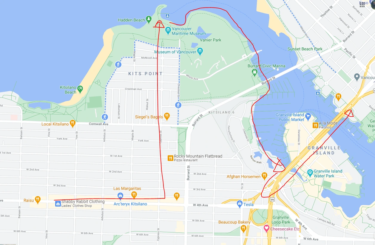 밴쿠버에 다시 갈 수 있다면 제일 좋아했던 산책 길을 다시 돌아보고 싶다. 그 산책길은 지도에서의 빨간 화살표로 키칠라노거리에서 시작해 그랜빌 아일랜드까지 걸어가는 것이다.
