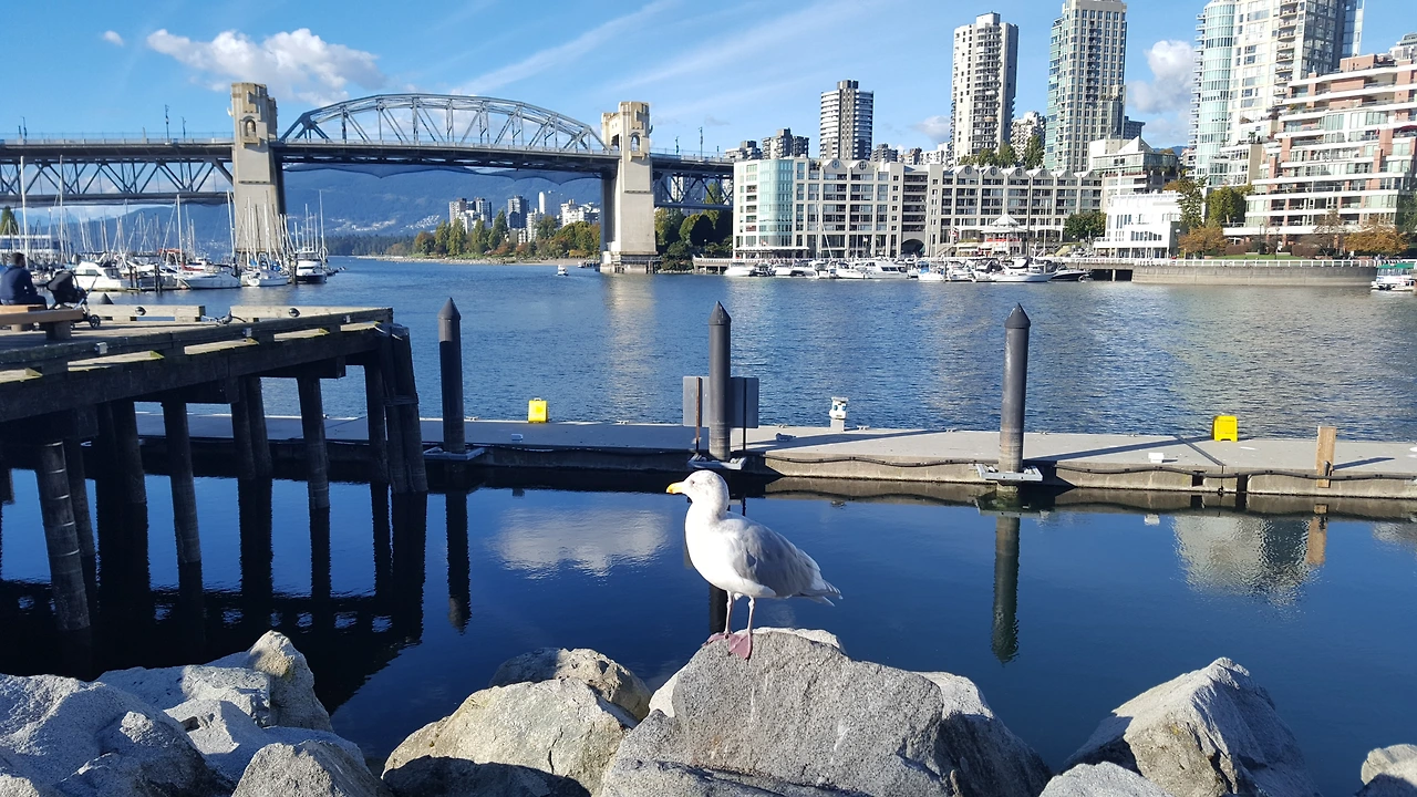 그리고 그 끝에 위치한 바다와 스탠리 파크, 선셋 비치가 보인다. 잠시 앉아 풍경을 감상한다. 그리고 바다를 보고 왼쪽으로 향해 계속 걸어가면 그 다음 목적지인 그랜빌 아일랜드로 갈 수 있다.