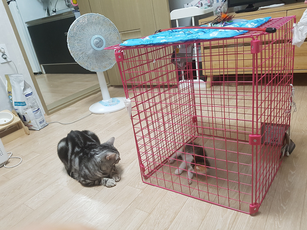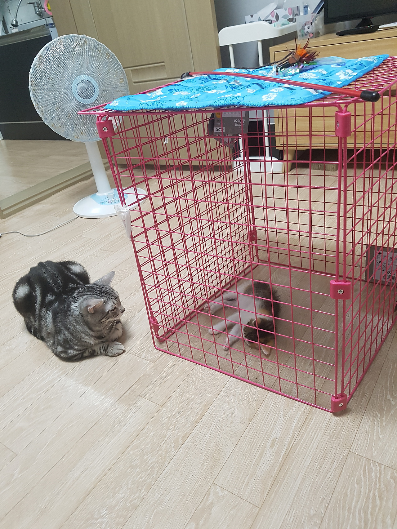 칠분의 일밖에 안되는 녀석이 내털을 건드릴 일이 없으니 배를 쭉 바닥에 붙이고 아깽이가 아가고양이를 얼마나 닮아나 보고 있다. 아무래도 누가 봐도 치즈대비인 아가 고양이를 삼색냥이 아깽이가 닮은 구석이 없다.